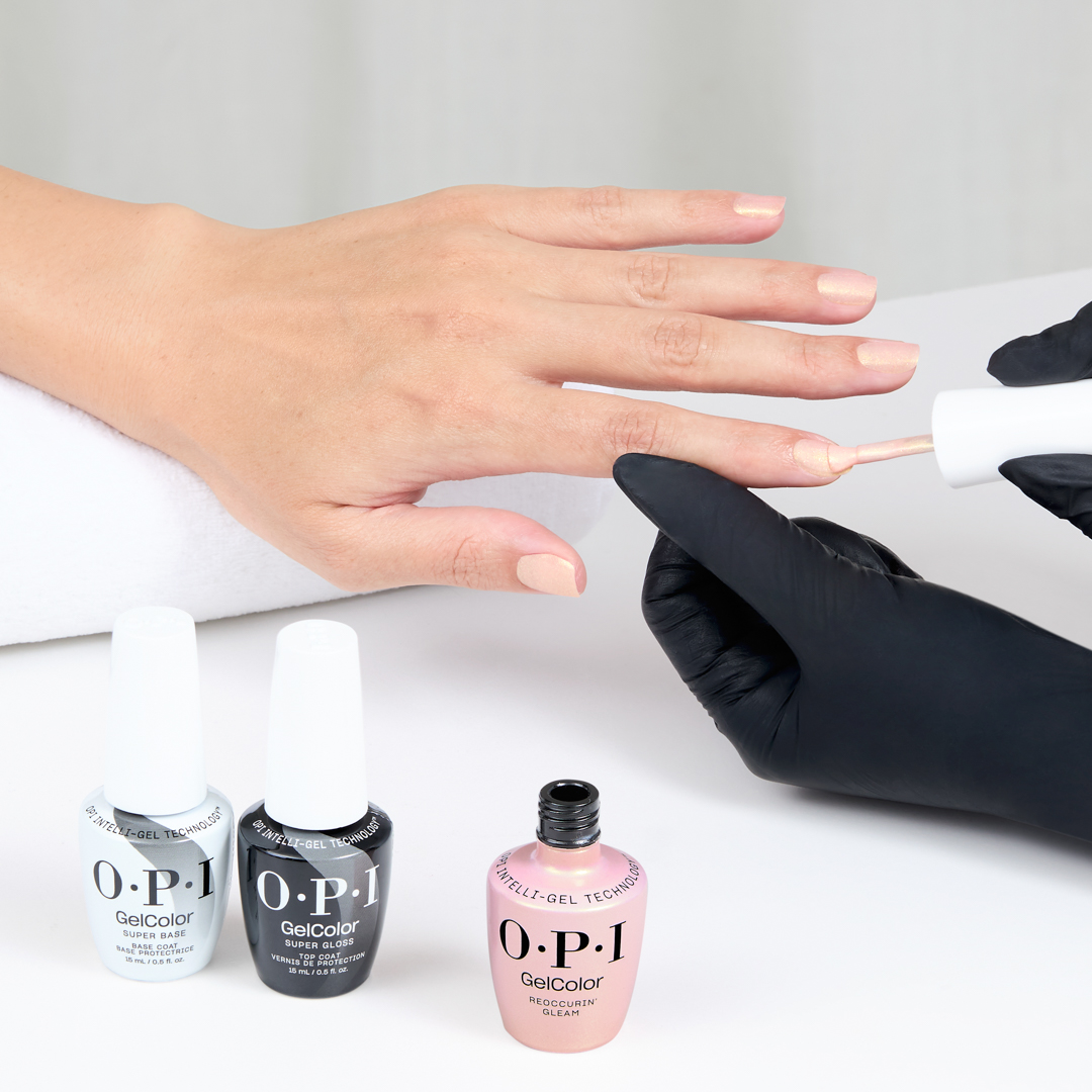 Aby uzyskać trwały manicure, przygotuj paznokcie, aplikując Bond-Aid pH Balancing Agent. Wstrząśnij buteleczką GelColor Super Base Base Coat przez 1 minutę, nałóż jedną warstwę bazy i utwardzaj przez 30 sekund w lampie OPI STAR LIGHT. Nałóż dwie cienkie warstwy koloru, każdą utwardzając przez 30 sekund. Zakończ, aplikując GelColor Super Gloss Top Coat i utwardzając przez 30 sekund. Usuń lepką warstwę top coatu wacikiem nasączonym N.A.S. 99.