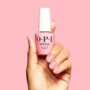Odpowiednie przygotowanie płytki paznokcia gwarantuje trwałość manicure hybrydowego. Nałóż jedną warstwę preparatu Bond-Aid pH Balancing Agent na każdy paznokieć. Przed użyciem bazy wstrząśnij buteleczkę GelColor Super Base Base Coat przez 1 minutę, następnie nałóż 1 warstwę bazy krótkimi pociągnięciami, zabezpieczając wolny brzeg paznokcia. Utwardzaj przez 30 sekund w lampie OPI STAR LIGHT. Wstrząśnij buteleczkę wybranego odcienia Bathtime Bubbly i nałóż cienką warstwę koloru, zabezpieczając wolny brzeg. Utwardzaj przez 30 sekund w lampie. Nałóż drugą warstwę koloru, powtarzając czynności. Na koniec energicznie wstrząśnij OPI GelColor Super Gloss Top Coat przez 1 minutę, nałóż cienką warstwę topu i zabezpiecz wolny brzeg. Utwardzaj w lampie przez 30 sekund. Usuń lepką warstwę za pomocą wacika nasączonego N.A.S. 99.
