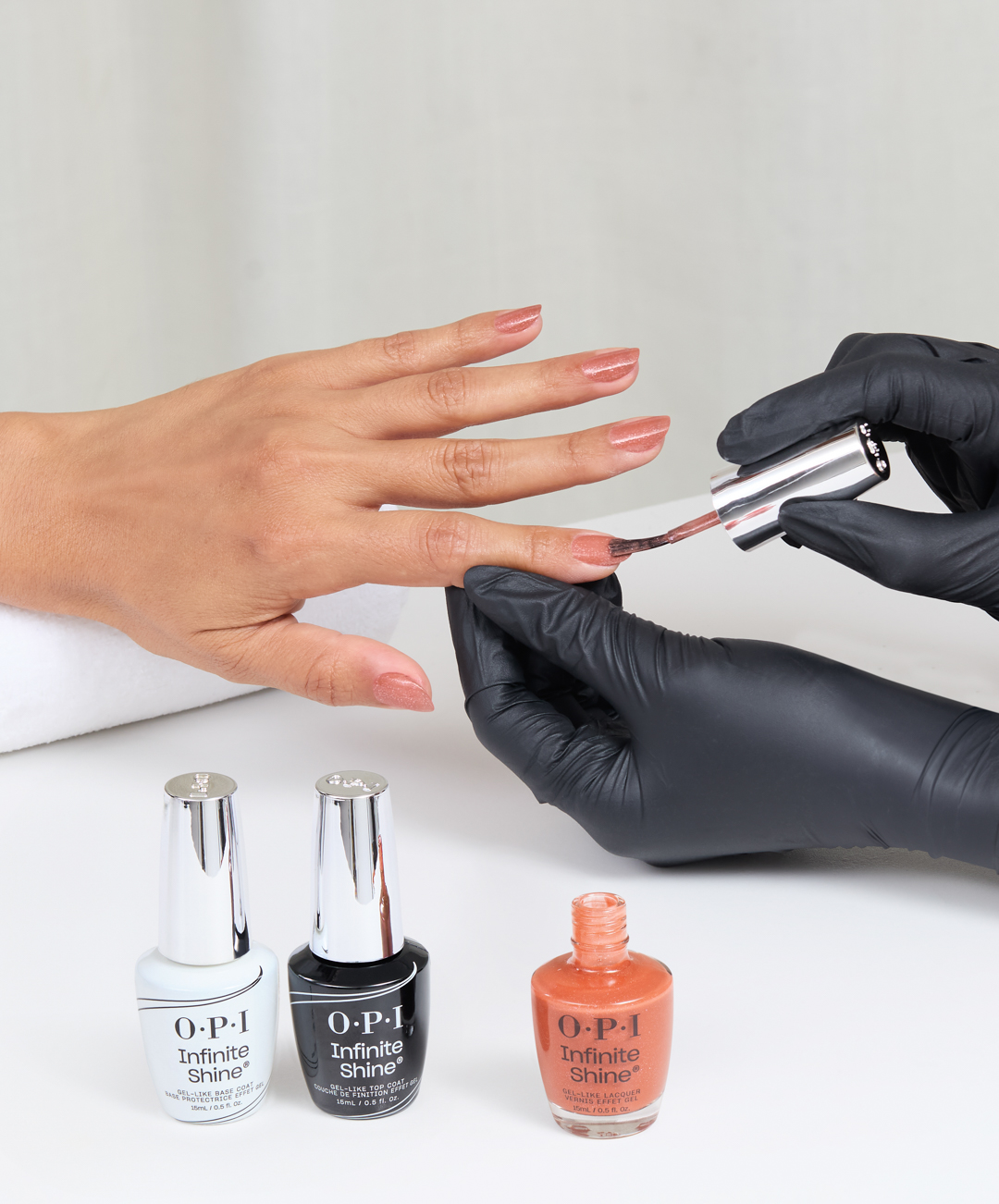 Krok 3: Zaaplikuj dwie cienkie warstwy lakieru OPI Infinite Shine Knee High Stock-blings, zabezpieczając wolny brzeg przy każdej warstwie. Każdą warstwę pozostaw do wyschnięcia na 1-2 minuty.