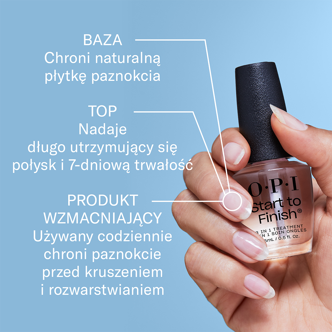 Kuracja 3w1 Start To Finish to wyjątkowy produkt, który może służyć jako baza, top coat lub odżywka do codziennego stosowania. Nakładaj go na czyste, niepomalowane paznokcie, aby cieszyć się pełnymi korzyściami pielęgnacyjnymi.