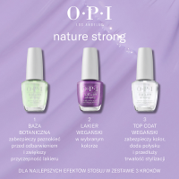 Aby uzyskać najlepsze rezultaty, nakładaj lakier OPI Nature Strong na bazę botaniczną OPI. Nałóż dwie cienkie warstwy lakieru w wybranym kolorze, pozwalając każdej z nich wyschnąć. Dla zabezpieczenia koloru i przedłużenia trwałości stylizacji, na koniec nałóż wegański Top Coat OPI.