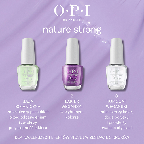 Aby uzyskać najlepsze rezultaty, nałóż lakier OPI Nature Strong na bazę botaniczną OPI. Aplikuj dwie cienkie warstwy lakieru, pozwalając każdej z nich wyschnąć. Dla zabezpieczenia koloru i przedłużenia trwałości, na koniec użyj wegańskiego Top Coat OPI.