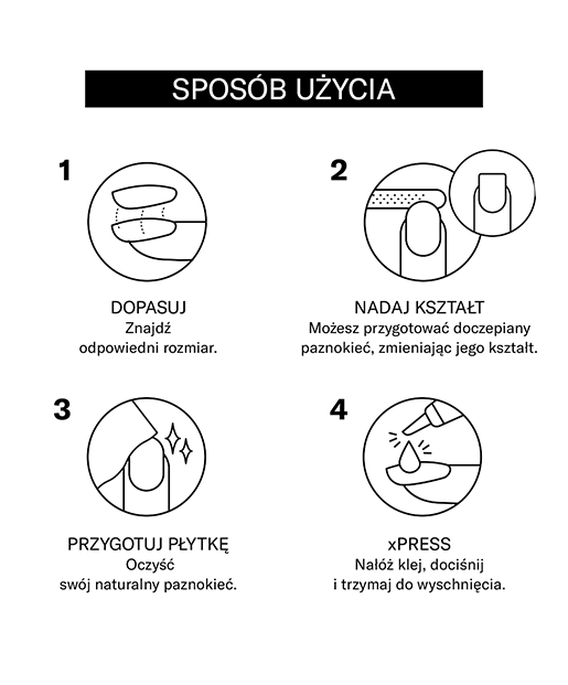 Przyklejanie: Nałóż klej na sztuczny i naturalny paznokieć, przytrzymaj przez 30 sekund dla lepszego przylegania.