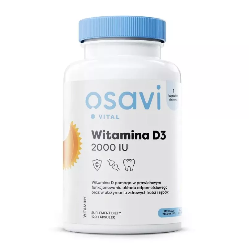 Osavi Witamina D3 2000IU to suplement diety w postaci miękkich kapsułek, zawierający witaminę D3 (cholekalcyferol) rozpuszczoną w oleju MCT z kokosa. Wykorzystuje Quali®-D, stabilną i biodostępną formę witaminy D3, naturalnie pozyskiwaną z lanoliny. Produkt wspiera układ odpornościowy, zdrowe kości i zęby oraz prawidłowe funkcjonowanie mięśni.