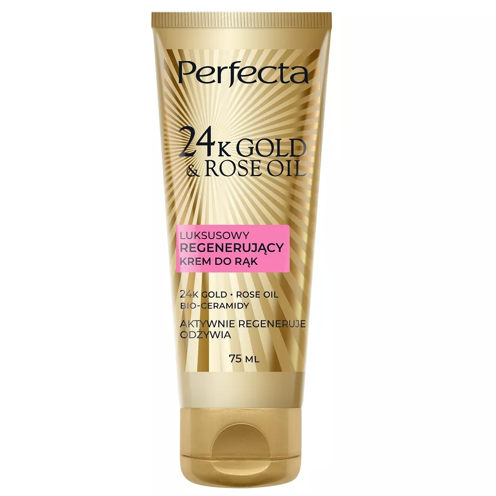 Perfecta 24K Gold & Rose Oil to luksusowy krem do rąk, który łączy w sobie zaawansowaną technologię molekuł złota oraz wyjątkowe właściwości pielęgnacyjne oleju różanego. Zapewnia kompleksową pielęgnację, nawilżenie, regenerację i odżywienie, przywracając skórze młody wygląd.