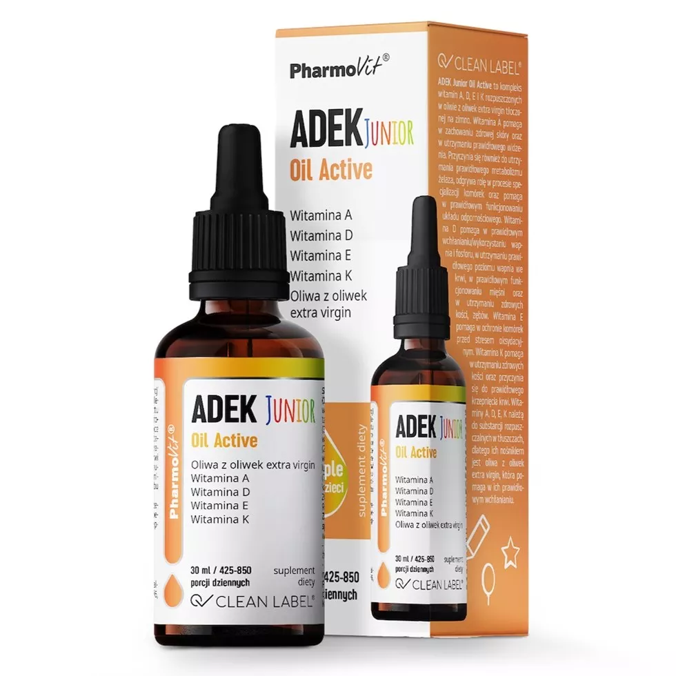 ADEK Junior Oil Active to wysokiej jakości suplement diety w kroplach, zawierający kompleks witamin A, D, E i K2 (MK-7) rozpuszczonych w oliwie z oliwek extra virgin tłoczonej na zimno. Produkt ten wspiera zdrową skórę, prawidłowe widzenie, metabolizm żelaza oraz funkcjonowanie układu odpornościowego. Dzięki zawartości witamin rozpuszczalnych w tłuszczach oraz nośnikowi w postaci oliwy z oliwek, suplement zapewnia efektywne wchłanianie.