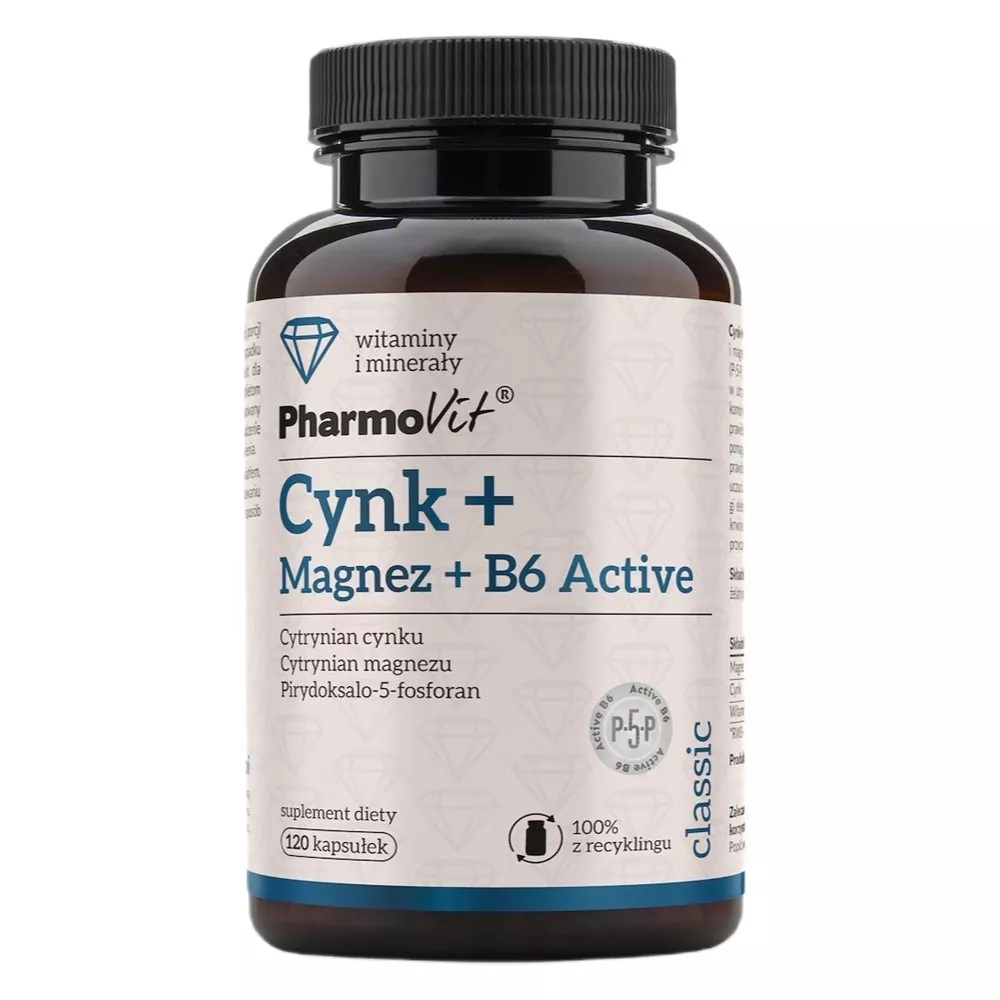 Cynk+Magnez+B6 Active to zaawansowany suplement diety łączący biodostępne formy cynku i magnezu oraz aktywną witaminę B6 w postaci pirydoksalo-5-fosforanu (P-5-P). Produkt ten wspiera zdrowie skóry, włosów, paznokci i kości, a także prawidłową syntezę białka, płodność i funkcje poznawcze. Magnez i witamina B6 wspomagają układ nerwowy, poprawiają funkcje psychologiczne oraz zmniejszają zmęczenie.