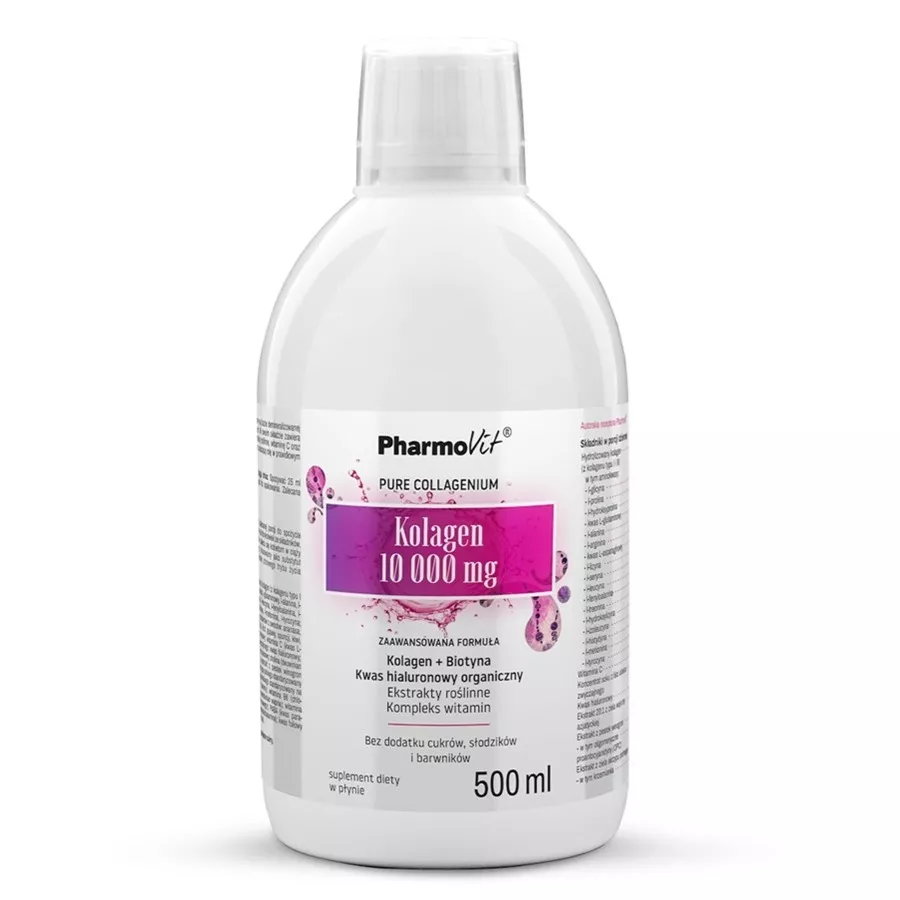 Pharmovit Kolagen 10000mg to innowacyjny suplement diety w płynie, który został stworzony na bazie demineralizowanej wody i naturalnych koncentratów owocowych. Zawiera hydrolizowany kolagen, kwas hialuronowy, ekstrakty roślinne, witaminę C oraz witaminy z grupy B. Te składniki odgrywają istotną rolę w prawidłowym funkcjonowaniu organizmu.