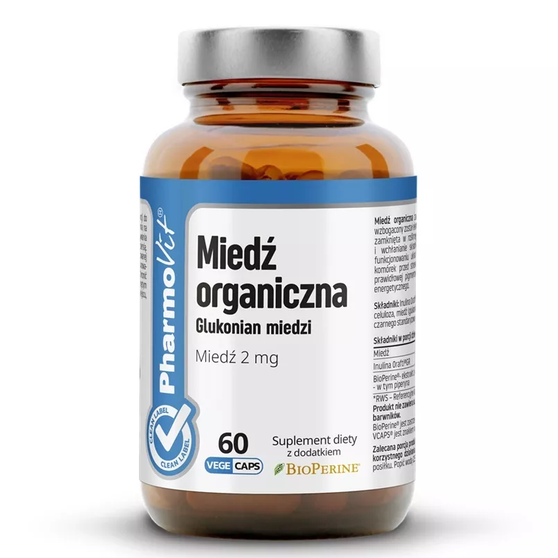 Pharmovit Miedź Organiczna glukonian miedzi suplement diety 60 kapsułek to produkt zawierający organiczną, biodostępną formę miedzi, wzbogaconą ekstraktem z pieprzu czarnego BioPerine®. Produkt zamknięty jest w roślinnej kapsułce, co czyni go odpowiednim dla wegan. Miedź wspomaga prawidłowe funkcjonowanie układu odpornościowego i nerwowego, chroni komórki przed stresem oksydacyjnym oraz pomaga w utrzymaniu zdrowego wyglądu skóry i włosów.