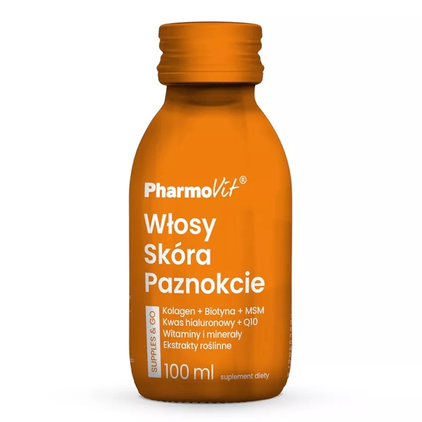 Pharmovit Włosy Skóra Paznokcie Supples & Go to unikalny suplement diety w płynie, który wspiera zdrowie włosów, skóry i paznokci. Dzięki starannie dobranym składnikom, takim jak kolagen, kwas hialuronowy, koenzym Q10, witaminy i minerały, produkt wspomaga naturalne procesy w organizmie, przyczyniając się do utrzymania pięknego wyglądu i kondycji skóry, włosów oraz paznokci.