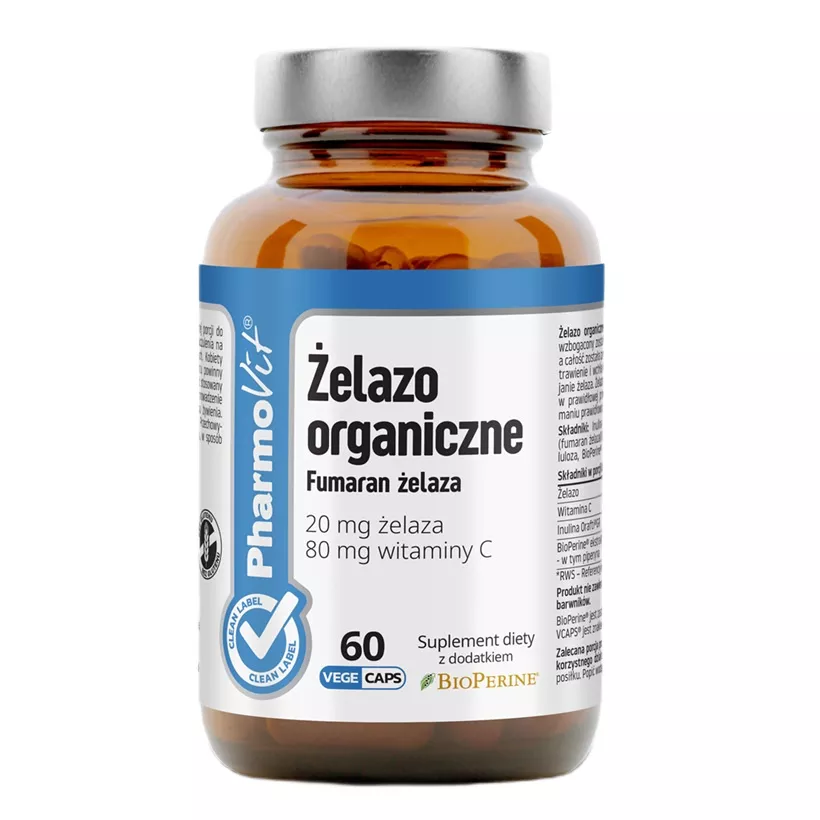 Pharmovit Żelazo organiczne 20mg to suplement diety, który dostarcza organiczną i biodostępną formę żelaza. Produkt wzbogacono ekstraktem z pieprzu czarnego BioPerine® oraz witaminą C, zamkniętych w roślinnej kapsułce. Pieprz czarny wspomaga trawienie i wchłanianie składników odżywczych, podczas gdy witamina C zwiększa przyswajanie żelaza. Żelazo jest kluczowe dla prawidłowego transportu tlenu w organizmie, produkcji czerwonych krwinek i hemoglobiny oraz utrzymania prawidłowych funkcji poznawczych.