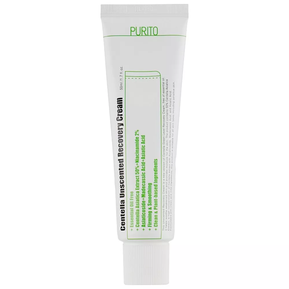 Purito Centella Unscented Recovery Cream to bezzapachowy krem regenerujący, zawierający aż 50% wyciągu z wąkroty azjatyckiej. Idealny do łagodzenia podrażnionej skóry, utrzymując ją promienną i zdrową. Produkt wzbogacony jest o azjatozyd, kwas azjatykowy, kwas madekasowy oraz ceramidy, które wzmacniają barierę ochronną skóry, zapobiegając nadmiernej transepidermalnej utracie wody.