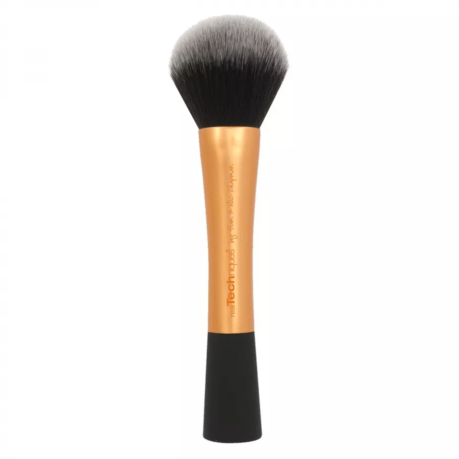 Real Techniques Powder Brush to niezwykle funkcjonalny pędzel do pudru, idealny do codziennego makijażu. Wykonany z miękkiego, syntetycznego włosia typu talkon, jest delikatny dla skóry i zapewnia równomierne rozprowadzenie kosmetyków. Jego aluminiowa rączka z gumowym zakończeniem umożliwia wygodne postawienie pędzla, co ułatwia jego przechowywanie.