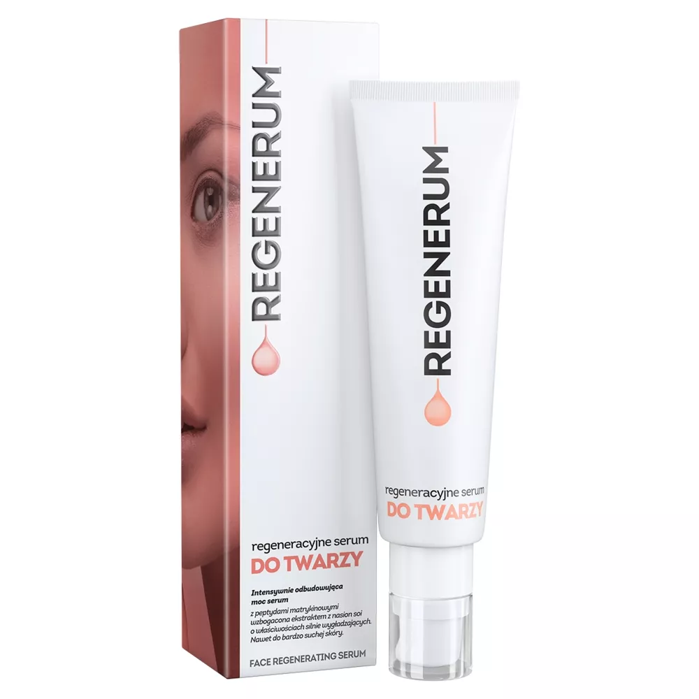 Regenerum Regeneracyjne serum do twarzy 50ml to intensywnie odbudowujące serum, które dzięki peptydom matrykinowym i ekstraktowi z nasion soi, skutecznie wygładza skórę, nawet tę bardzo suchą.