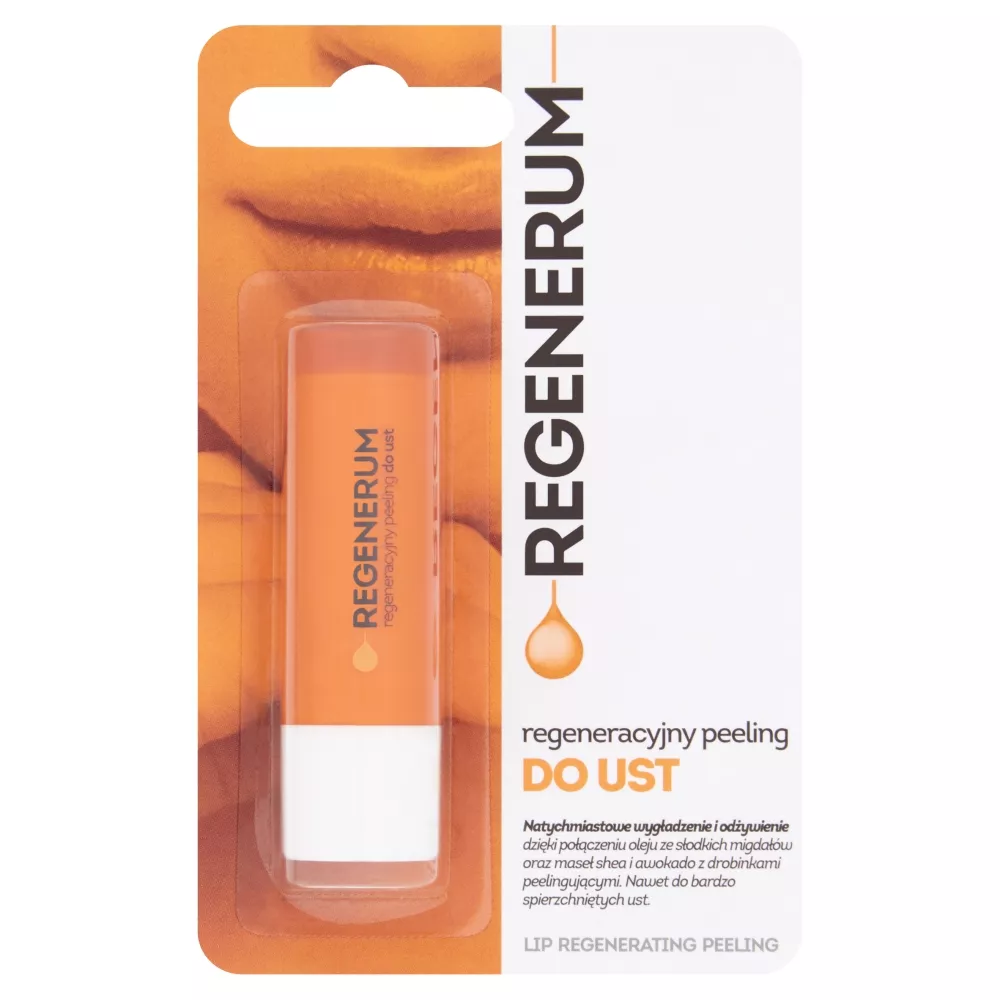 Regenerum Regeneracyjny peeling do ust 5g to produkt, który natychmiastowo wygładza i odżywia skórę ust dzięki połączeniu oleju ze słodkich migdałów oraz maseł shea i awokado z drobinkami peelingującymi. Idealny dla nawet bardzo spierzchniętych ust, zapewnia intensywne nawilżenie i przywraca jędrność, miękkość oraz gładkość.