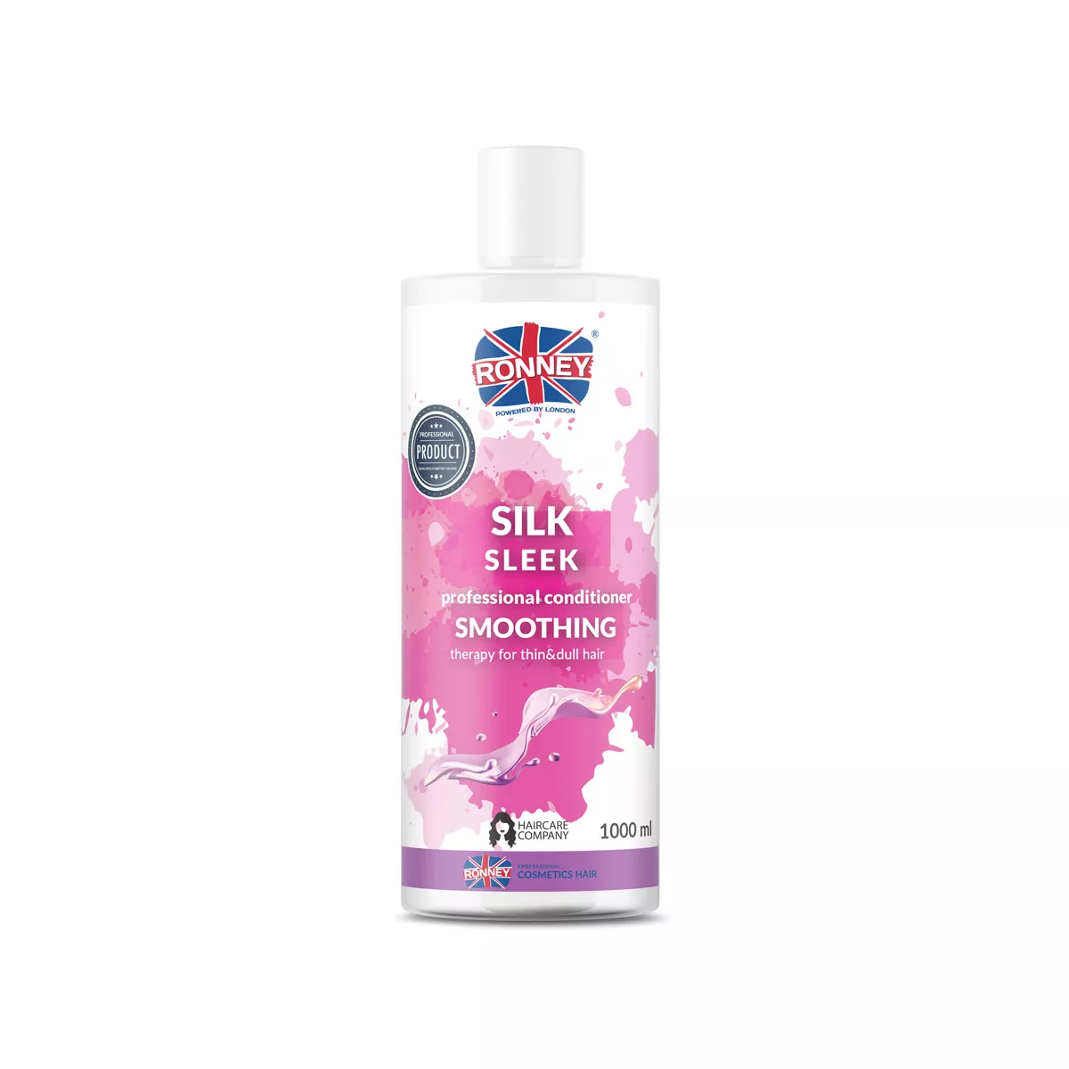 RONNEY Professional Conditioner Smoothing Silk Sleek to odżywka stworzona specjalnie dla włosów cienkich i matowych. Dzięki zawartości hydrolizowanych protein jedwabiu, zapewnia ona odpowiedni poziom nawilżenia, jednocześnie poprawiając kondycję włosów. Włosy po jej użyciu stają się bardziej elastyczne, łatwe do rozczesania i układania, a także zyskują piękny połysk oraz zdrowy wygląd.