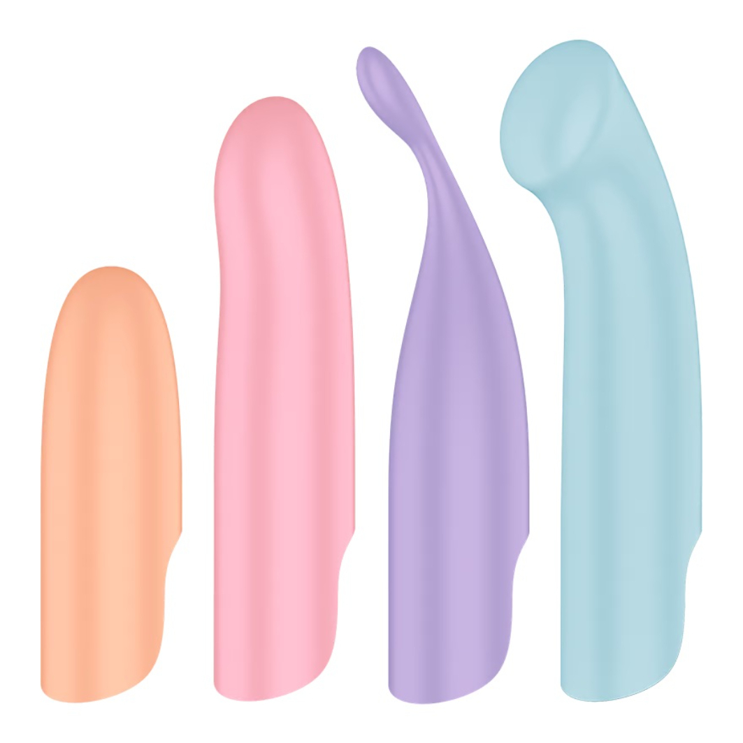 Zakładana końcówka punktu G z zakrzywionym profilem i spłaszczoną główką idealnie trafia w Twój wewnętrzny sweet spot. Mały, ale intensywny rękaw lay-on serwuje skoncentrowane wibracje na łechtaczce. Klasyczny wibrator – lekko zakrzywiony – dostarcza uniwersalnych doznań punktowi G i łechtaczce. A końcówka z wąskim czubkiem to mistrz precyzyjnej stymulacji – od sutków, przez wargi sromowe, aż po krocze.