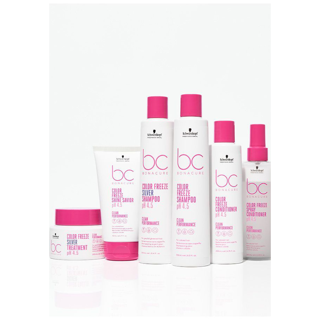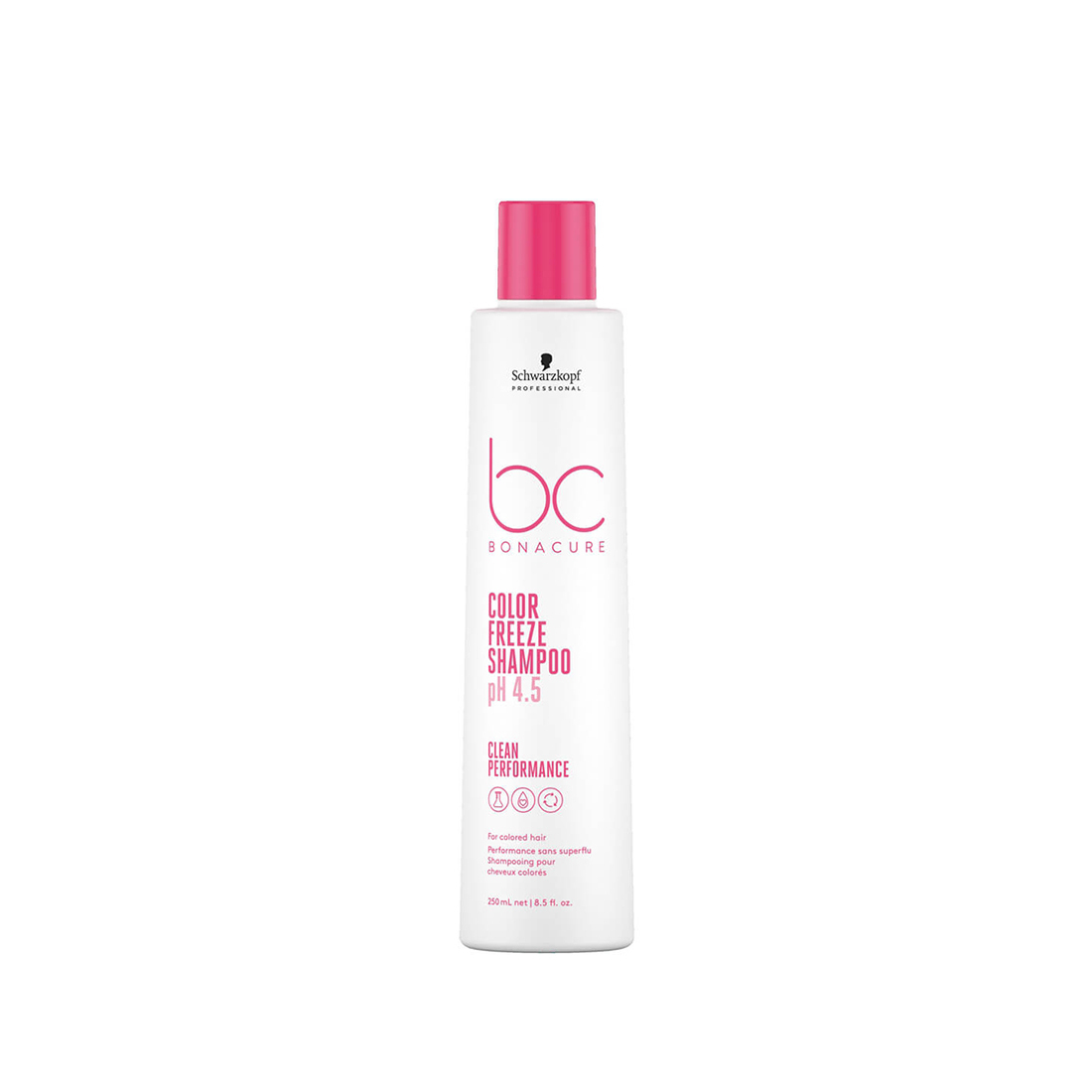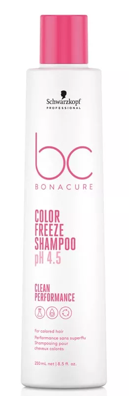 Szampon do włosów farbowanych Schwarzkopf BC Color Freeze dzięki zawartości kwasu mlekowego i wodorotlenku wapnia, napina i stabilizuje macierz włosa przy optymalnym pH 4,5, aby głęboko zamrozić pigmenty barwnika wewnątrz macierzy włosa, zapewniając perfekcję koloru i efekt ochrony przed jego blaknięciem. To pierwszy wegański system blokowania koloru od Schwarzkopf Professional, który chroni kolor przed blaknięciem i przedłuża trwałość jego intensywności.