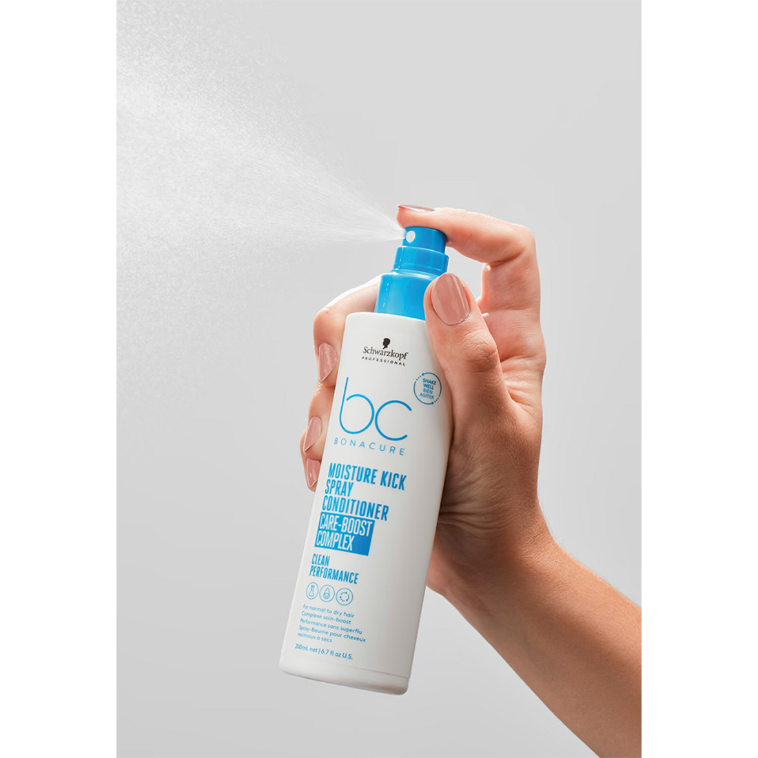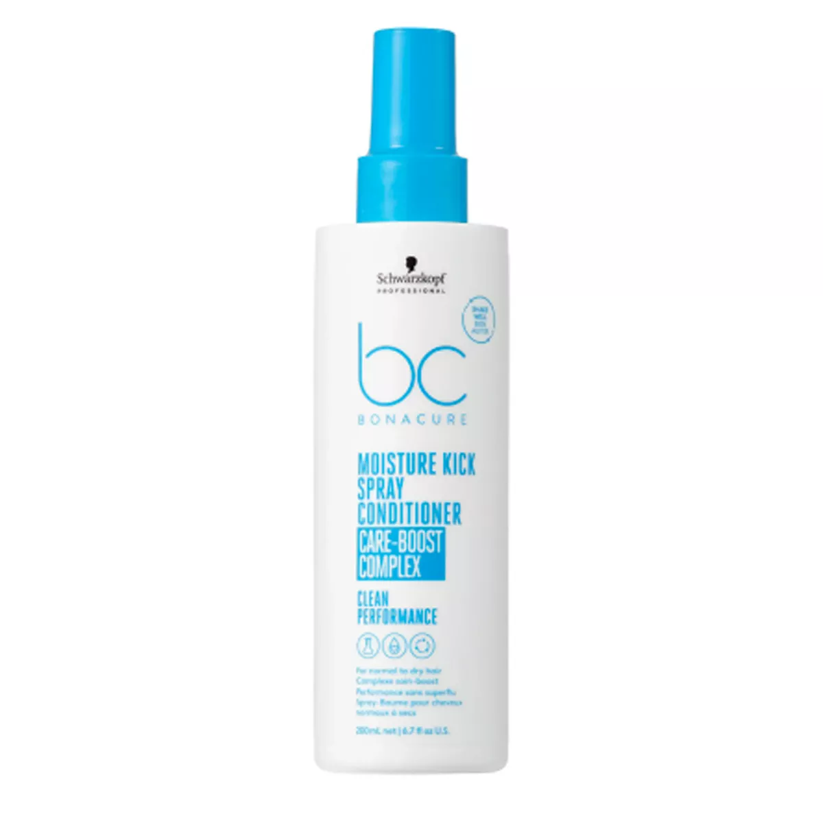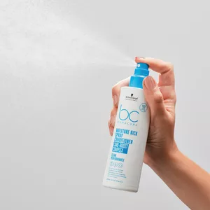 Lekka odżywka do włosów suchych i normalnych Schwarzkopf BC Moisture Kick w sprayu natychmiast przywraca włosom miękkość i odpowiedni poziom nawodnienia. Pasma są łatwiejsze do rozczesania i ułożenia. Ponadto stają się gładsze i zyskują zdrowy połysk. Odżywka dwufazowa Schwarzkopf chroni przed ciepłem suszarki. Kosmetyk nadaje się także do pielęgnacji kręconych włosów - świetnie odświeża i podkreśla skręt loków. Kosmetyk składa się z fazy kremowej i fazy wodnej, które po wstrząśnieniu tworzą lekką emulsję, która bez obciążania nawilża i pielęgnuje włosy.