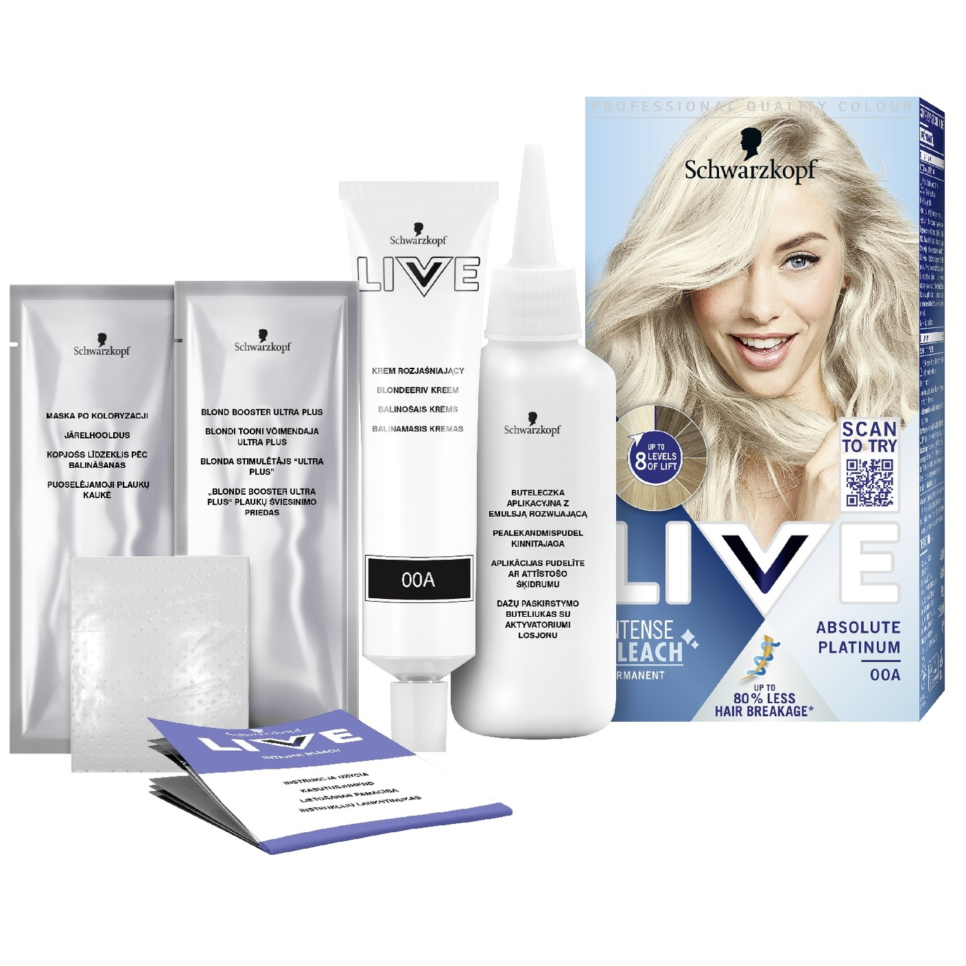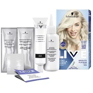 Lubisz, gdy Twoje włosy wyróżniają się z tłumu i promienieją blaskiem przez długi czas? Ultra rozjaśniacz do włosów Schwarzkopf Live Intense Bleach 00A Absolute Platinum zapewni Ci rozjaśnienie aż do 8 odcieni i pozwoli uzyskać intensywny i czysty platynowy blond z pięknym i długotrwałym połyskiem. Już teraz stwórz olśniewające kolory z równomiernym rezultatem od nasady aż po same końce!