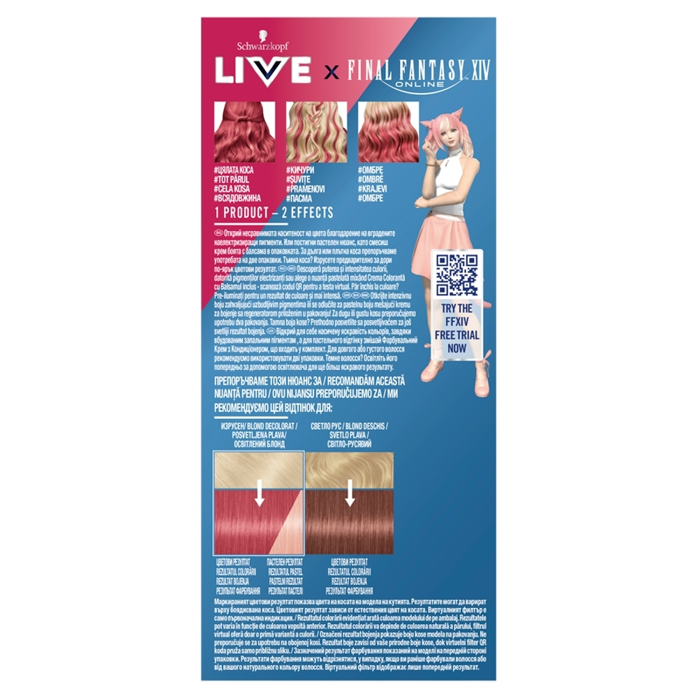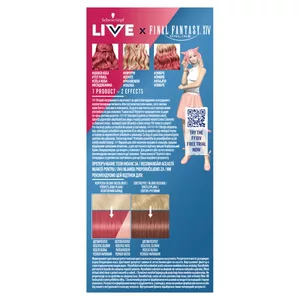 Odkryj intensywną żywość koloru dzięki Schwarzkopf LIVE Ultra Brights. Ta półtrwała farba do włosów oferuje dwa efekty w jednym produkcie: elektryzujące pigmenty dla intensywnego koloru lub pastelowy odcień dzięki mieszance kremu koloryzującego z odżywką. Produkt inspirowany jest popularną grą FINAL FANTASY XIV Online, a efekt koloryzacji utrzymuje się do 15 myć.