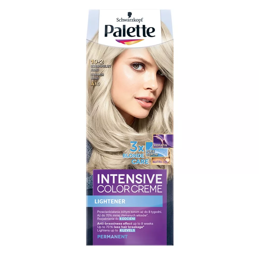 Odkryj intensywny i promienny blask z farbą do włosów Schwarzkopf Palette Intensive Color Creme Lightener w odcieniu 10-2 (A10) Ultrapopielaty Blond. Ta innowacyjna farba rozjaśniająca zapewnia niewiarygodnie intensywne i długotrwałe kolory, które wibrują blaskiem. Formuła farby głęboko wnika we włosy, zamykając w nich intensywne pigmenty i zapewniając fascynujący połysk. Dodatkowo, pielęgnacja włosów po koloryzacji jest zapewniona dzięki masce z Systemem Potrójnej Pielęgnacji Blondu, zawierającej keratynę, serum Plex i odżywczy olejek, co zmniejsza łamliwość włosów nawet o 70%*.