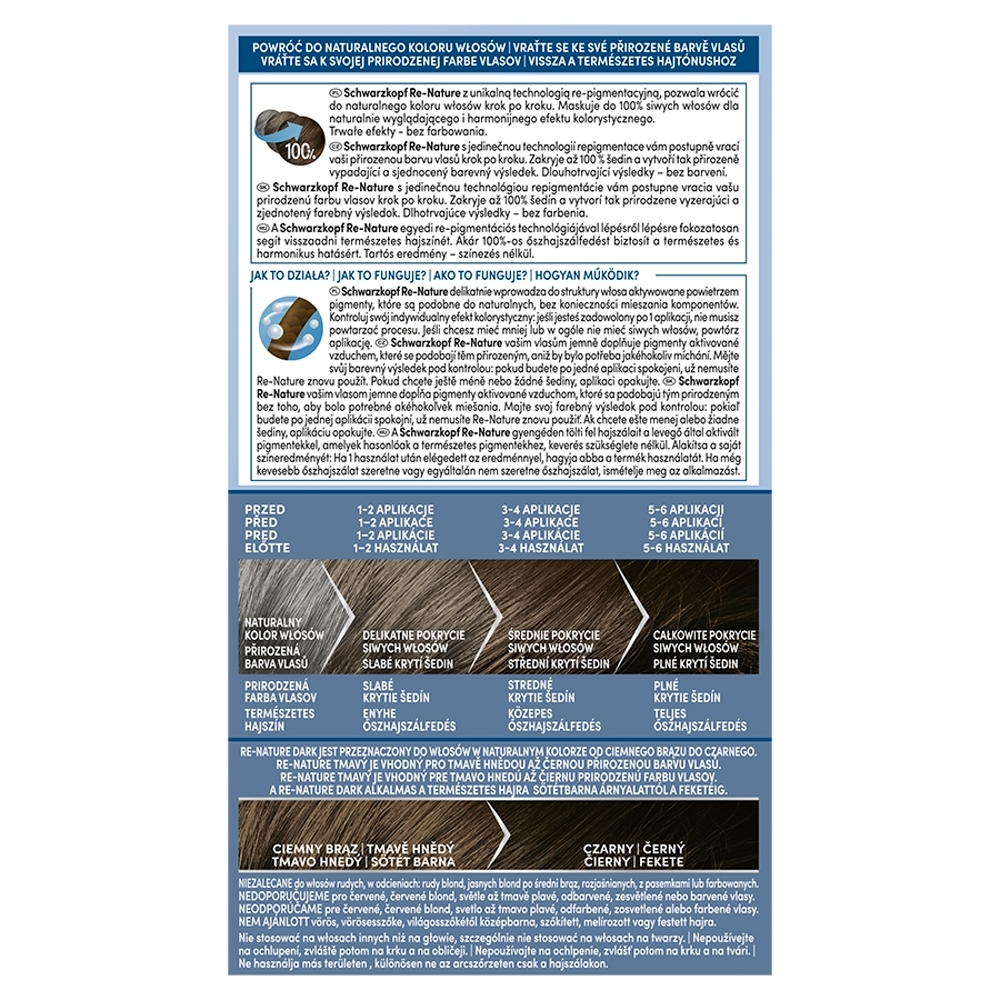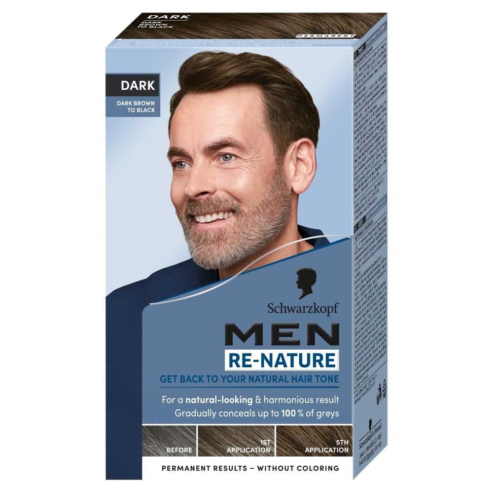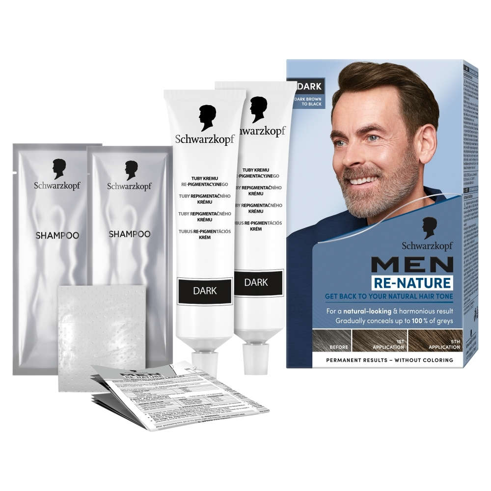 Schwarzkopf Re-Nature Men krem re-pigmentacyjny Dark to innowacyjne rozwiązanie, które pozwala na stopniowy powrót do naturalnego koloru włosów z wykorzystaniem unikalnej technologii re-pigmentacyjnej. Produkt skutecznie maskuje do 100% siwych włosów, zapewniając naturalny i harmonijny efekt kolorystyczny – wszystko to bez konieczności farbowania włosów.