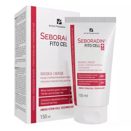 Maska nowej generacji zawiera ekstrakt z roślinnych komórek macierzystych PhytoCellTecTM Malus Domestica. W jej skład dodatkowo wchodzi: korzeń chinowca, miód, proteiny mleczka jedwabiu i olej arganowy. Dzięki bogactwu składników aktywnych maska Seboradin FITO CELL intensywnie wzmacnia i regeneruje włosy, które stają się odżywione i wyraźnie zmniejsza się ich łamliwość. Zapobiega rozdwajaniu końcówek. Przy regularnym stosowaniu pełnej kuracji włosy nabierają blasku, zyskują zdrowy wygląd, łatwiej się rozczesują, są bardziej gęste, mocniejsze i odporniejsze na uszkodzenia. Wypadanie włosów wyraźnie się zmniejsza.