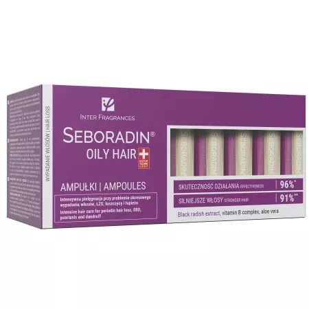 Ampułki zawierają kompleks witamin z grupy B, aloes, ekstrakty roślinne: z czarnej rzodkwi, kłączy tataraku, ziela dziurawca, olejki eteryczne: kolendrowy, z drzewa herbacianego, tymol oraz olej rycynowy, które odżywiają i wzmacniają włosy. Włosy są bardziej gęste, mocne, mniej się przetłuszczają. Ampułki nie obciążają włosów i nie powodują ich wysuszenia, dają efekt odpowiedniego nawilżenia włosów i skóry głowy. Regularne stosowanie produktów wchodzących w skład kuracji Seboradin OILY HAIR wygładza zniszczoną strukturę włosów, zmniejsza dyskomfort skóry, zaczerwienienie i świąd. Produkty wchodzące w skład serii Seboradin OILY HAIR zapewniają skórze głowy i włosom efektywną pielęgnację przy: wzmożonym wypadaniu włosów, ŁZS, łuszczycy oraz łupieżu. Włosy stają się zdrowsze, w lepszej kondycji, bardziej lśniące, o większej witalności. *Skuteczna pielęgnacja włosów i skóry głowy (ŁZS, łuszczyca, łupież) – ocena efektów regularnego stosowania kuracji Seboradin OILY HAIR (szampon, balsam, lotion, ampułki) przez okres 6 tygodni.**Test samooceny działania kuracji pod kontrolą dermatologiczną. Skuteczność działania została potwierdzona w badaniach aparaturowych przez niezależne, specjalistyczne laboratorium badawcze. Przebadano łącznie na panelu 250 osób, u których w wywiadzie występowały: ŁZS, łuszczyca w remisji, łupież tłusty, nasilone objawy wypadania i przerzedzania się włosów.