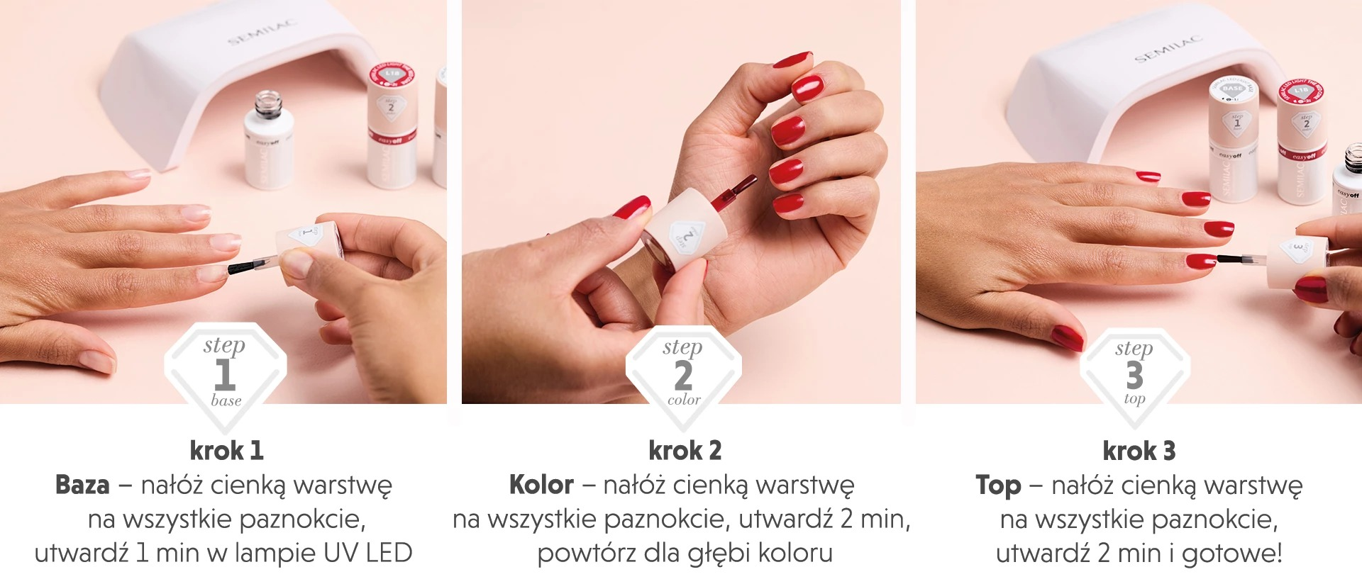 - Krok 2: Nałóż cienką warstwę lakieru, utwardź przez 2 minuty. Dla głębszego koloru powtórz czynność.
