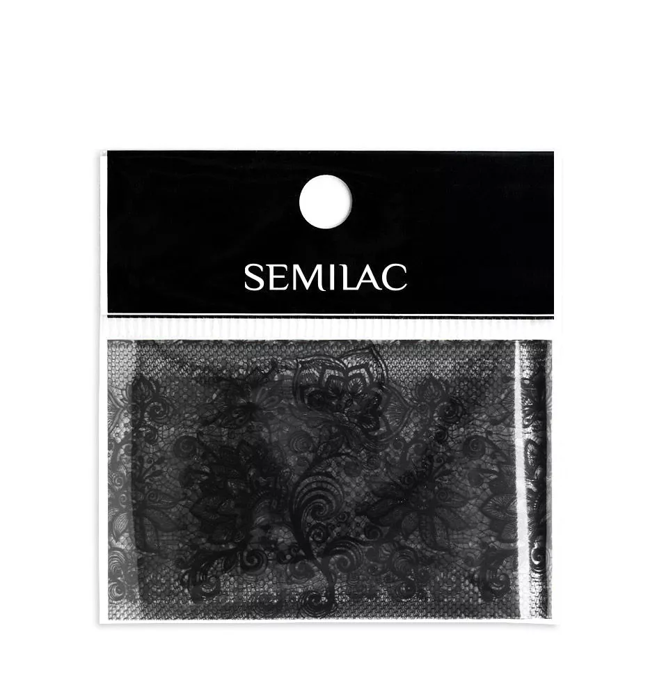 Koronkowa folia transferowa w kolorze czarnym, Semilac Black Lace, to idealne rozwiązanie do zdobienia paznokci, które pozwala szybko i łatwo uzyskać niezwykle ciekawe efekty. Czarną, wzorzystą koronkową folię najlepiej połączyć z bielą, odcieniami nude i szarością. Folia nadaje stylizacji paznokci elegancji, a jej nieoczywisty, pełen abstrakcyjnej głębi wzór przyciąga uwagę. Świetnie sprawdza się jako drobny element stylizacji paznokci, choćby na jednym paznokciu. Folia polecana jest do metody hybrydowej i żelowej. Rekomenduje się używanie z Semilac Transfer Foil Glue.