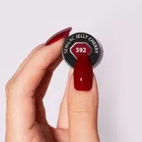Inspirowany kultowym motywem Cherry Coke, lakier hybrydowy Semilac 592 Jelly Cherry to idealny wybór na zimowe miesiące. Odcień ten wprowadza odrobinę ciepła do chłodnych stylizacji, a jednocześnie nawiązuje do retro-trendu powracającego na salony. Dzięki półtransparentnej formule, zapewnia paznokciom wyjątkowy blask i unikalny charakter Glass Nails. Nałożony na dowolną bazę kryjącą z portfolio Semilac, zachwyca głębokim wiśniowym kolorem, stając się nową ikoną wśród wiśniowych odcieni!