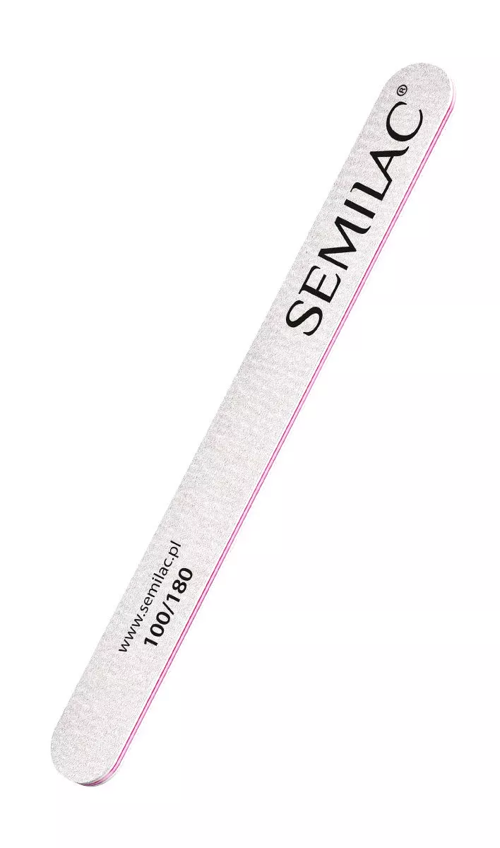 Semilac, pilnik prosty 100/180 Semilac Quality to dwustronny pilnik o gradacji średnio średnioziarnistej, idealny do wielofunkcyjnego użytku. Posiada on stronę drobnoziarnistą o gradacji 180 oraz średnioziarnistą o gradacji 100. Dzięki swojemu prostemu kształtowi, ten pilnik jest idealny do opracowywania zarówno naturalnych, jak i przedłużanych paznokci. Świetnie nadaje się do piłowania żelu, akrylu oraz modelowania konkretnego kształtu paznokcia.