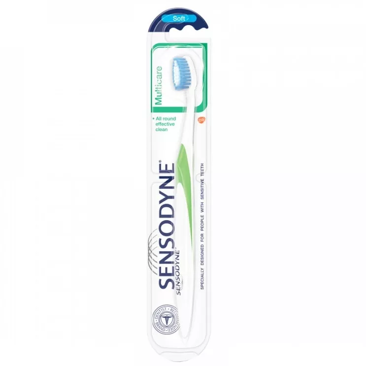 Szczoteczka Sensodyne MultiCare Soft została specjalnie zaprojektowana dla osób cierpiących na wrażliwość zębów, by zapewnić im delikatne i dokładne oczyszczanie jamy ustnej. Jej mała, zaokrąglona główka pozwala dotrzeć do trudno dostępnych oraz delikatnych obszarów zębów i dziąseł, zapewniając kompleksowe czyszczenie. Specjalna, antypoślizgowa rączka zapewnia dobrą kontrolę podczas szczotkowania zębów.