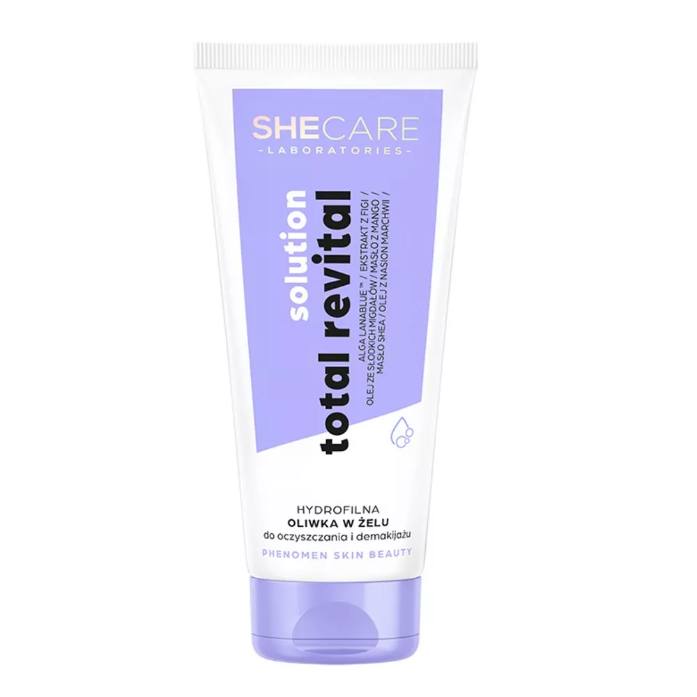 SheCare Total Revital Solution to hydrofilna oliwka w żelu do oczyszczania i demakijażu, idealna dla każdego typu skóry, a szczególnie dla suchej i wymagającej. Dzięki swojej formule doskonale usuwa zanieczyszczenia, nadmiar sebum oraz makijaż, jednocześnie nawilżając i chroniąc barierę hydro-lipidową skóry.