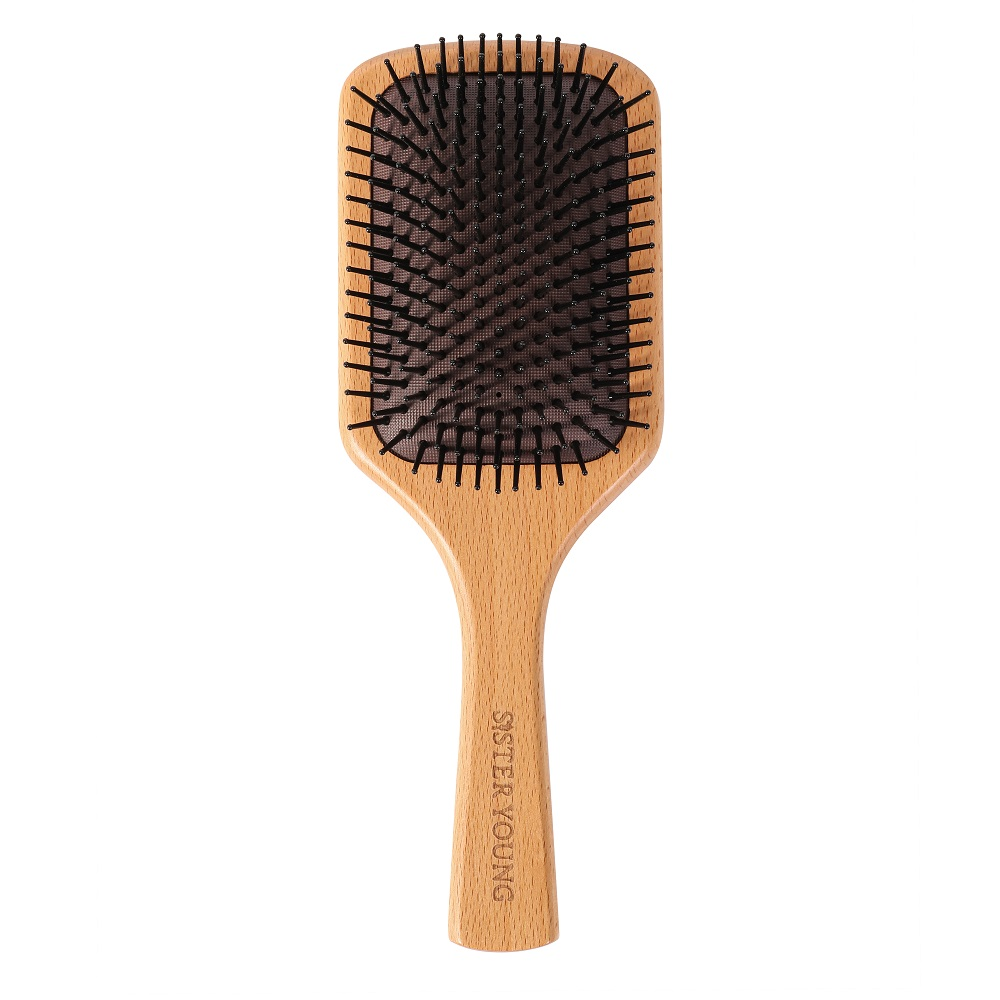 Sister Young Naya Hair Brush to wysokiej jakości drewniana szczotka do włosów typu paddle brush, idealna do codziennego rozczesywania, wygładzania i stylizacji wszystkich rodzajów włosów – zwłaszcza grubych, gęstych i długich. Wykonana z naturalnego drewna bukowego oraz elastycznego, nylonowego włosia zakończonego kulkami, skutecznie rozplątuje nawet najbardziej wymagające pasma, nie powodując szarpania ani wyrywania włosów. Zapewnia zdrowy, błyszczący wygląd kosmyków, redukuje puszenie i zapobiega elektryzowaniu się włosów. Ergonomiczny, antypoślizgowy uchwyt gwarantuje komfort użytkowania, a przemyślany otwór wentylacyjny wydłuża żywotność szczotki, dbając o jej świeżość i higienę.