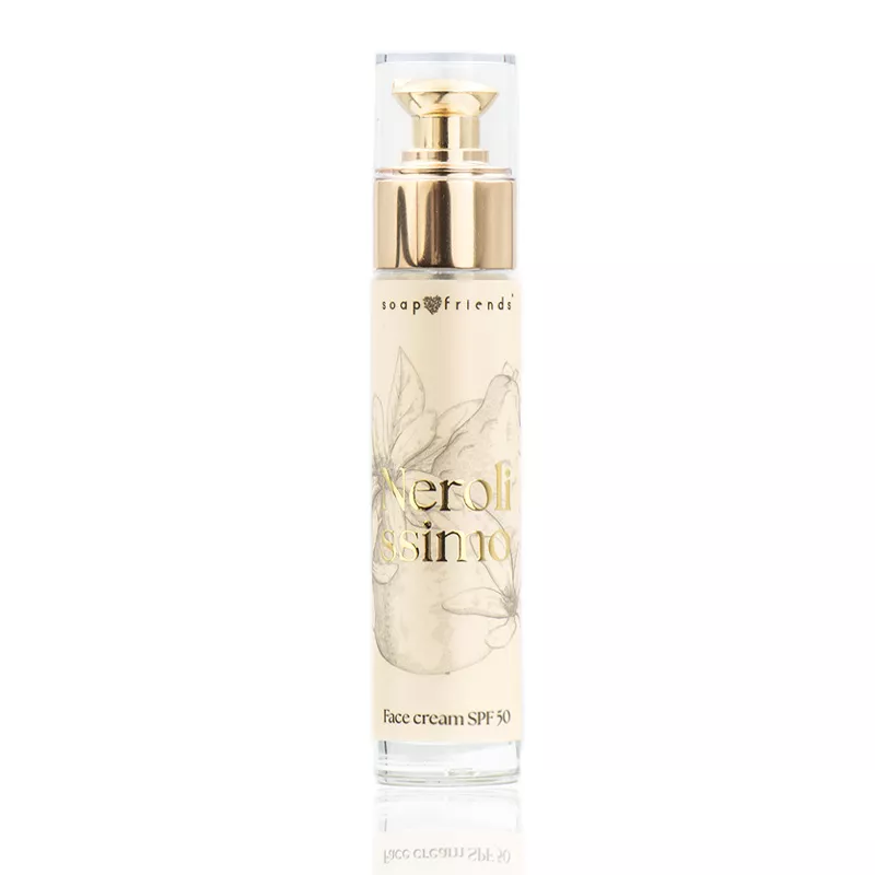 Soap&Friends Nerolissimo krem do twarzy SPF50 50ml to wodoodporny krem na dzień, oferujący wysoką ochronę przed szkodliwym promieniowaniem UV dzięki faktorowi SPF 50. Jego lekka formuła zapewnia szybką i przyjemną aplikację, a świeży zapach serii Nerolissimo dodaje energii na cały dzień. Regularne stosowanie kremu pomaga zredukować ryzyko podrażnień słonecznych, przebarwień skóry i działa przeciwzmarszczkowo.