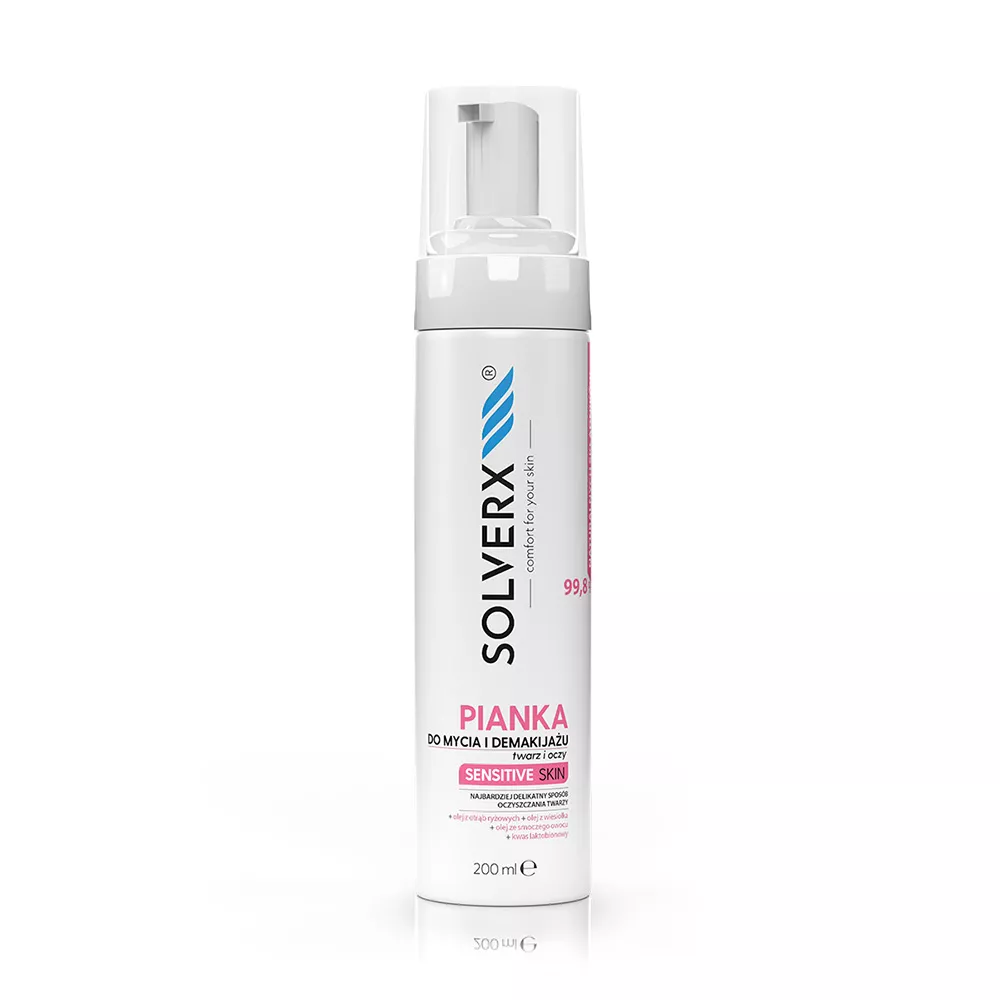 Solverx Sensitive Skin for Women to delikatna pianka do mycia i demakijażu twarzy oraz oczu, stworzona z myślą o skórze wrażliwej i naczyniowej. Dzięki unikalnej formule, dokładnie oczyszcza skórę, przygotowując ją na przyjęcie kolejnych produktów pielęgnacyjnych. Zawiera składniki takie jak olej z otrąb ryżowych, który zmiękcza i wygładza skórę, oraz olej z nasion wiesiołka, który wykazuje silne działanie nawilżające. Olej z nasion smoczego owocu ujędrnia skórę, uelastycznia ją i wyrównuje koloryt. Produkt wzbogacony jest również w prebiotyki wspierające naturalny mikrobiom skóry.