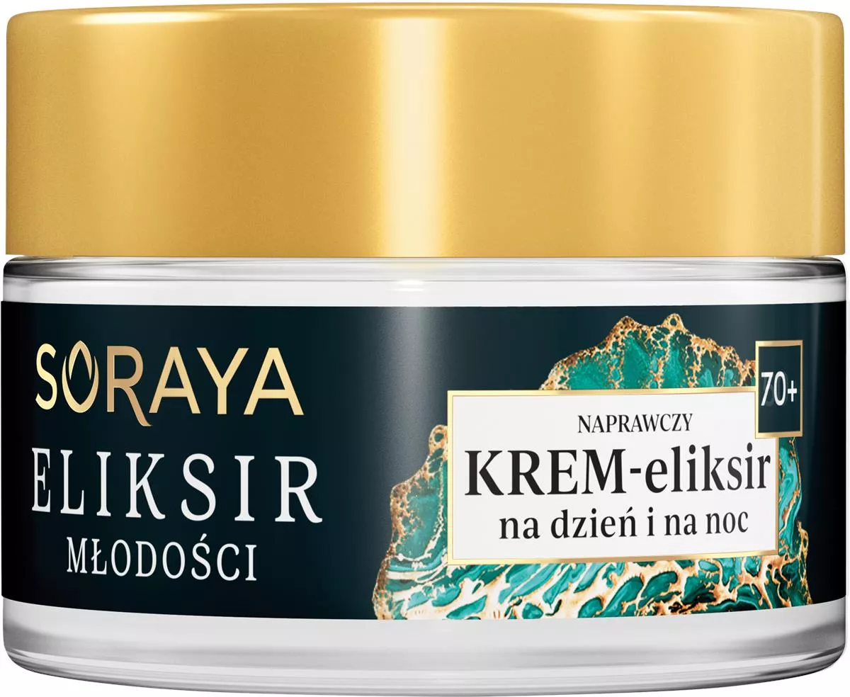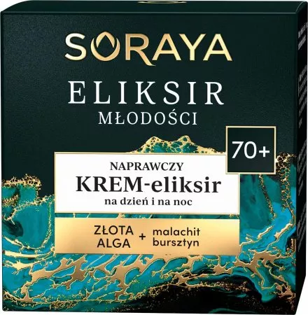 Soraya Eliksir Młodości Naprawczy krem 70+ dzień/noc 50ml to luksusowy kosmetyk do pielęgnacji cery dojrzałej, stworzony z myślą o intensywnej regeneracji i odmłodzeniu skóry. Unikalna, szlachetna formuła kremu wykorzystuje znane składniki anti-ageing, a także moc kamieni szlachetnych, by przywracać skórze nawilżenie, jędrność i gładkość. Połączenie złotej algi, malachitu i bursztynu zapewnia kompleksowe działanie przeciwstarzeniowe, poprawiając wygląd i kondycję skóry już po kilku dniach regularnego stosowania.