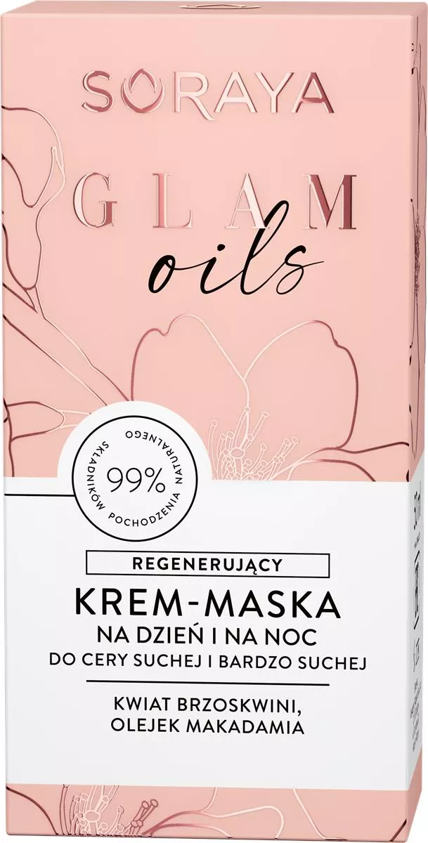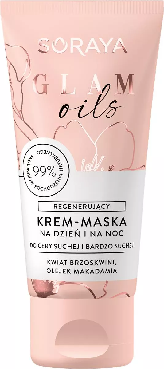 Soraya Glam Oils to regenerujący krem-maska na dzień i na noc, który dzięki bogatej formule zapewnia intensywne odżywienie oraz regenerację suchej i bardzo suchej skóry. Zawiera aż 98% składników pochodzenia naturalnego, skutecznie przywracając gładkość, miękkość oraz eliminując uczucie szorstkości i dyskomfortu. Regularne stosowanie kremu poprawia wygląd skóry, podkreślając jej naturalne piękno i zdrowy blask.
