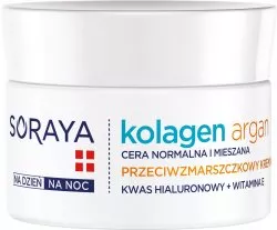 Soraya Kolagen+Argan Przeciwzmarszczkowy krem nawilżający to skuteczna pielęgnacja przeciw oznakom starzenia dla skóry twarzy, szyi i dekoltu. Zaawansowana formuła oparta na kolagenie, oleju arganowym, kwasie hialuronowym oraz witaminie E, wyraźnie poprawia jędrność, zapewnia intensywne nawilżenie oraz działa regenerująco na naskórek. Krem idealnie sprawdza się do codziennego stosowania, również pod makijaż, a jego lekka konsystencja szybko się wchłania, pozostawiając skórę sprężystą i jedwabiście gładką.