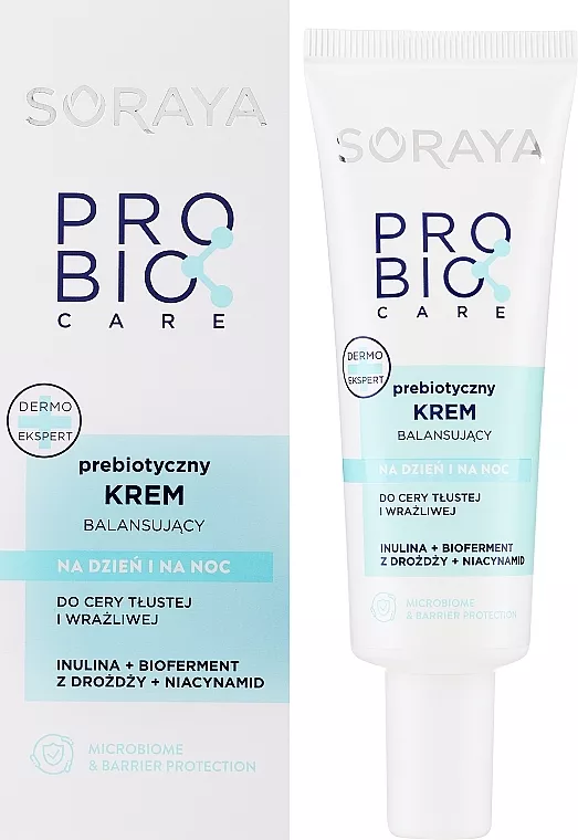 Soraya Probio Care prebiotyczny krem do cery tłustej i wrażliwej to innowacyjny kosmetyk stworzony specjalnie dla osób ze skórą wymagającą szczególnej troski. Jego delikatna formuła wspiera naturalny mikrobiom skóry, chroni i odbudowuje barierę naskórkową, a jednocześnie skutecznie redukuje nadmierną produkcję sebum. Produkt idealnie sprawdzi się w codziennej pielęgnacji skóry wrażliwej, tłustej i podatnej na podrażnienia, zapewniając jej komfort, nawilżenie oraz zdrowy, promienny wygląd.