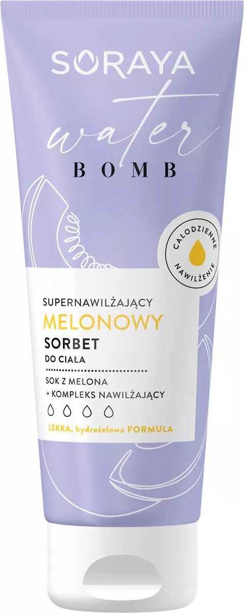 Soraya Water Bomb Melonowy sorbet do ciała to prawdziwa bomba nawilżenia, która zapewni Twojej skórze intensywne i długotrwałe nawodnienie. Unikalna, lekka hydrożelowa formuła oparta na soku z melona oraz kompleksie silnie nawilżających substancji sprawia, że skóra jest chroniona przed utratą wody i pozostaje miękka oraz gładka przez cały dzień. Ten supernawilżający balsam zachwyca nie tylko skutecznością, ale także radosnym, melonowym kolorem oraz niezwykłym zapachem z nutami melona, banana, truskawki i wanilii. Sorbet szybko się wchłania, nie pozostawiając uczucia lepkości ani tłustości, dzięki czemu doskonale sprawdzi się podczas cieplejszych miesięcy.