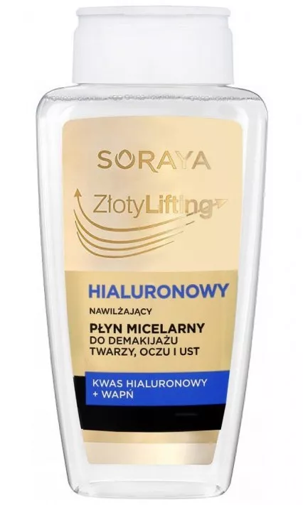 Soraya Złoty Lifting, hialuronowy płyn micelarny, to innowacyjny kosmetyk do codziennego oczyszczania twarzy, oczu i ust. Dzięki zawartości kwasu hialuronowego skutecznie usuwa makijaż i zanieczyszczenia, jednocześnie dbając o odpowiedni poziom nawilżenia skóry. Jego delikatna formuła koi podrażnienia, przywracając cerze świeżość, gładkość i miękkość. To doskonały wybór dla osób poszukujących skutecznego i zarazem łagodnego produktu do demakijażu, który troszczy się o zdrowy wygląd skóry każdego dnia.