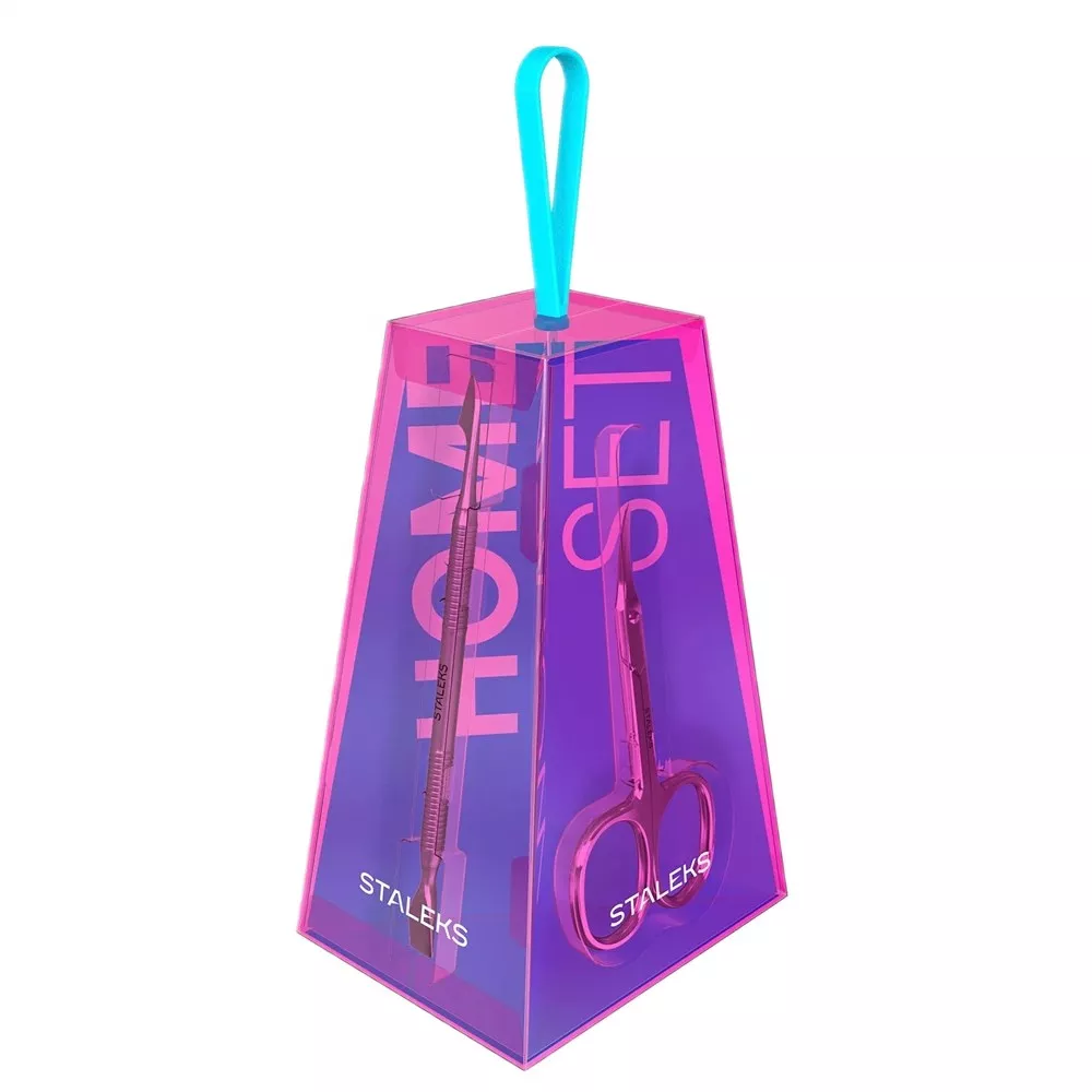 Każde z narzędzi jest ergonomiczne, lekkie i wygodne w użyciu, co umożliwia łatwe i szybkie wykonanie zabiegów pielęgnacyjnych, nawet bez doświadczenia kosmetycznego. Zestaw zapakowany jest w estetyczne, przezroczyste pudełko w kształcie ściętej piramidy z logo Staleks. Opakowanie nie tylko zabezpiecza zawartość, ale również przyciąga wzrok swoim nowoczesnym designem. To świetny i praktyczny pomysł na prezent dla niej.