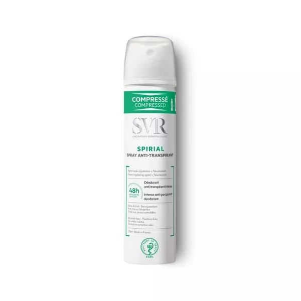 SVR Spirial Spray Anti-Transpirant to intensywny antyperspirant o działaniu 48-godzinnym, idealny dla każdego rodzaju skóry, w tym najbardziej wrażliwej. Doskonale sprawdza się w przypadku zarówno normalnego, jak i nadmiernego pocenia się. Może być stosowany na pachy, dłonie oraz stopy, zapewniając długotrwałą świeżość i komfort.
