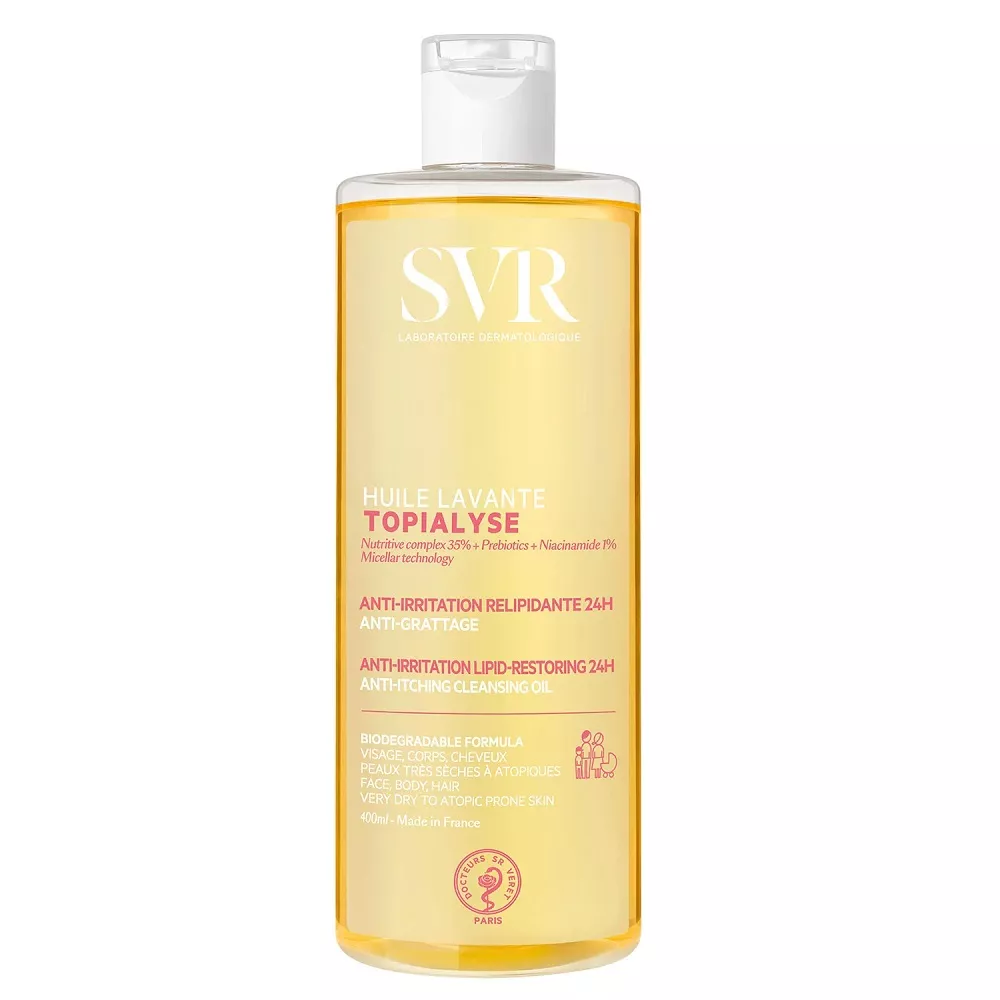 SVR Topialyse Huile Lavante to wielofunkcyjny olejek do mycia i kąpieli, który zastępuje tradycyjne produkty takie jak żel pod prysznic, płyn do kąpieli, szampon, płyn do higieny intymnej, a także płyn do mycia twarzy i rąk oraz demakijażu. Jego łagodna formuła nie podrażnia oczu, a przyjemna, jedwabista konsystencja zapewnia 24-godzinne nawilżenie, przynosząc skórze natychmiastowy i długotrwały komfort. Idealny dla całej rodziny, w tym niemowląt od urodzenia (z wyjątkiem wcześniaków).