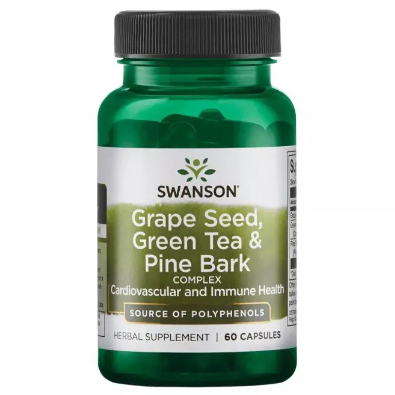 Swanson Grape Seed, Green Tea & Pine Bark to suplement diety, który łączy w sobie moc trzech naturalnych składników: winorośli właściwej, herbaty chińskiej oraz sosny Massona. Każda kapsułka dostarcza kluczowych składników, które wspierają organizm w codziennych wyzwaniach.