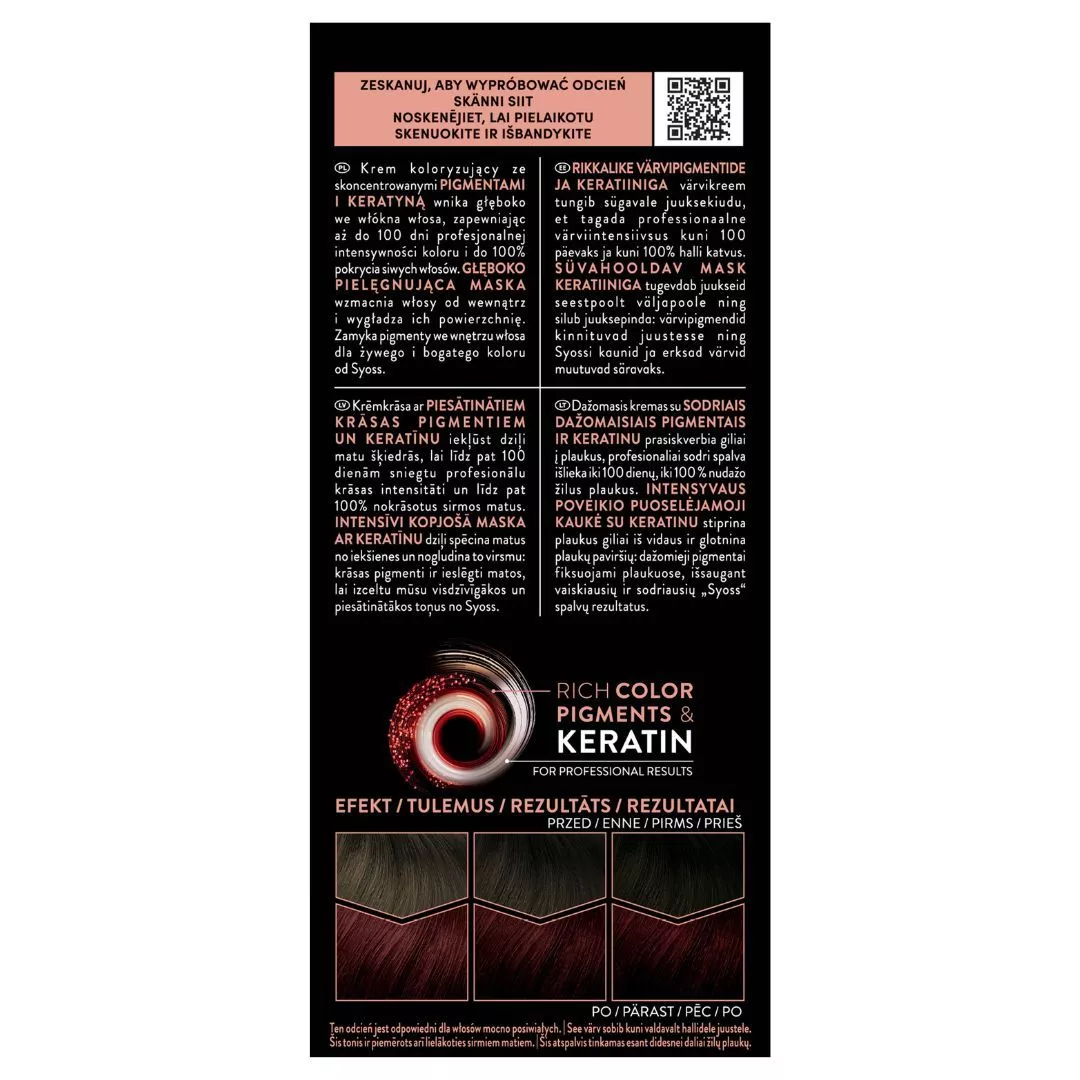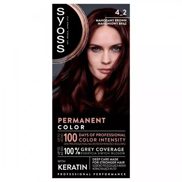 Odkryj intensywny, długotrwały kolor z farbą do włosów Syoss Permanent Coloration w odcieniu 4-2 Mahoniowy Brąz. Ta trwale koloryzująca farba zapewnia pełne pokrycie siwych włosów i profesjonalny efekt jak z salonu fryzjerskiego. Dzięki połączeniu technologii SalonPlex i keratyny, Twoje włosy zyskają żywe, elektryzujące kolory oraz ochronę przed uszkodzeniami.