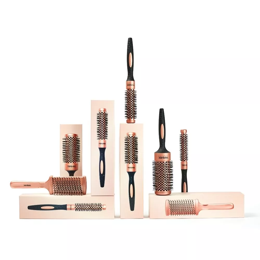 Profesjonalna szczotka termiczna Termix Profesional Rose Gold została wykonana ze specjalnych włókien odpornych na temperaturę. Dzięki temu pozwala zredukować czas suszenia nawet o 50%! Szczotki charakteryzują się niesamowitą trwałością, a to wszystko dzięki bardzo skrupulatnemu procesowi produkcji, w którym zrezygnowano z użycia kleju na rzecz obróbki termicznej. W efekcie szczotki są bardzo wytrzymałe i odporne. Świetnie sprawdzą się zarówno w salonie fryzjerskim, jak i w domowym użyciu.